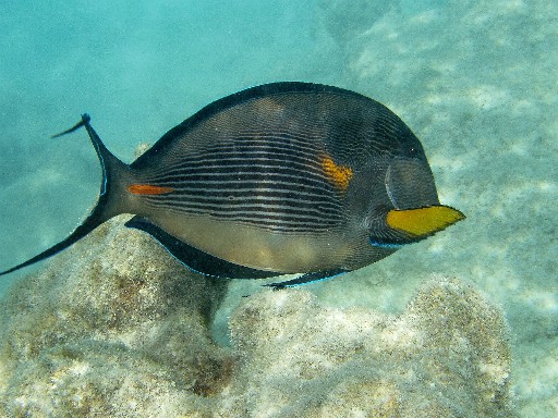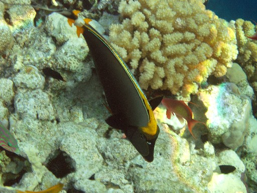 А эта рыба очень агрессивная! Нападала на инструктора по дайвингу, когда они плавали с мужем. Прокусила ласту как компостером. Ее размер в длину около метра и очень приличные зубы.