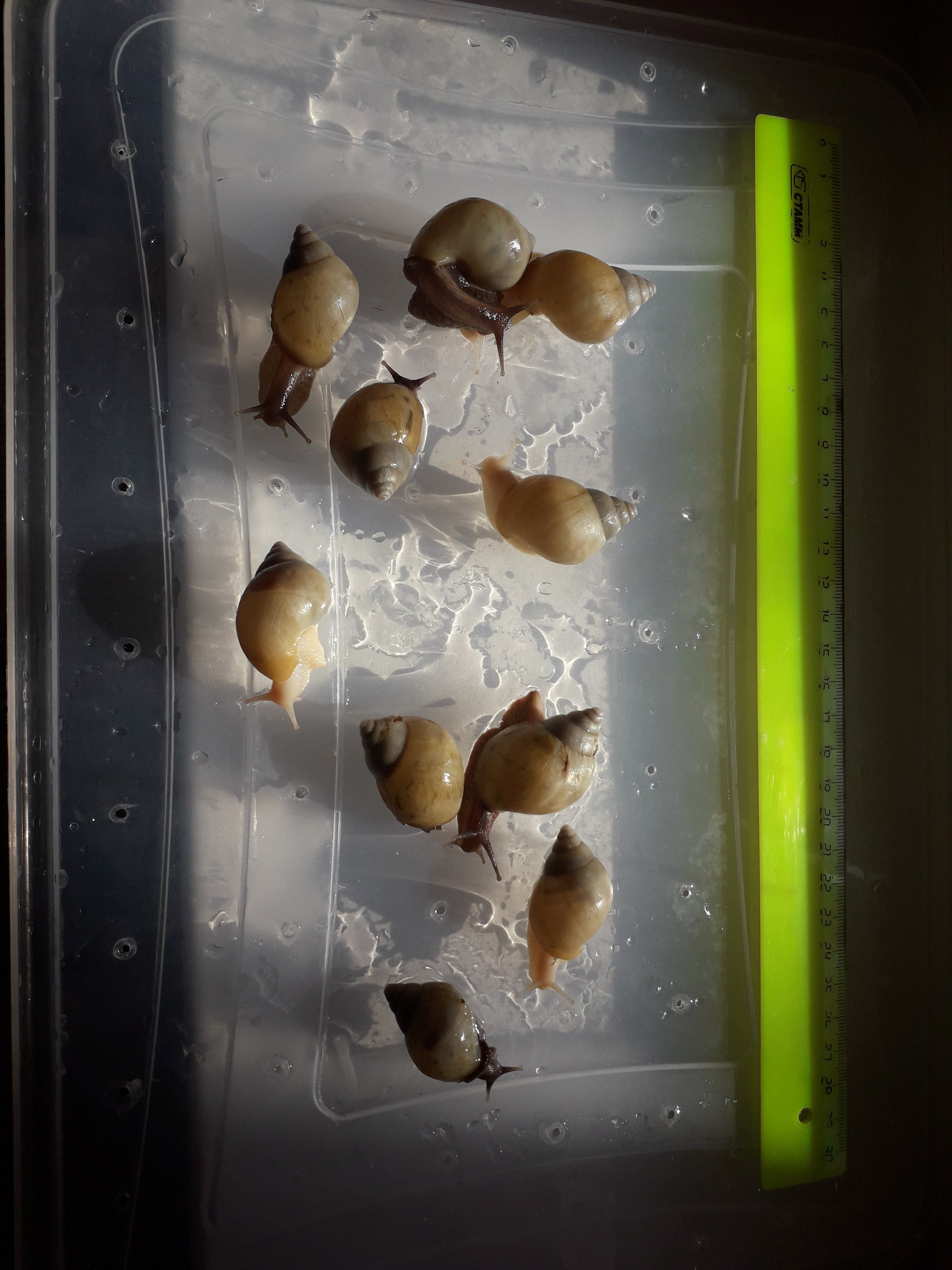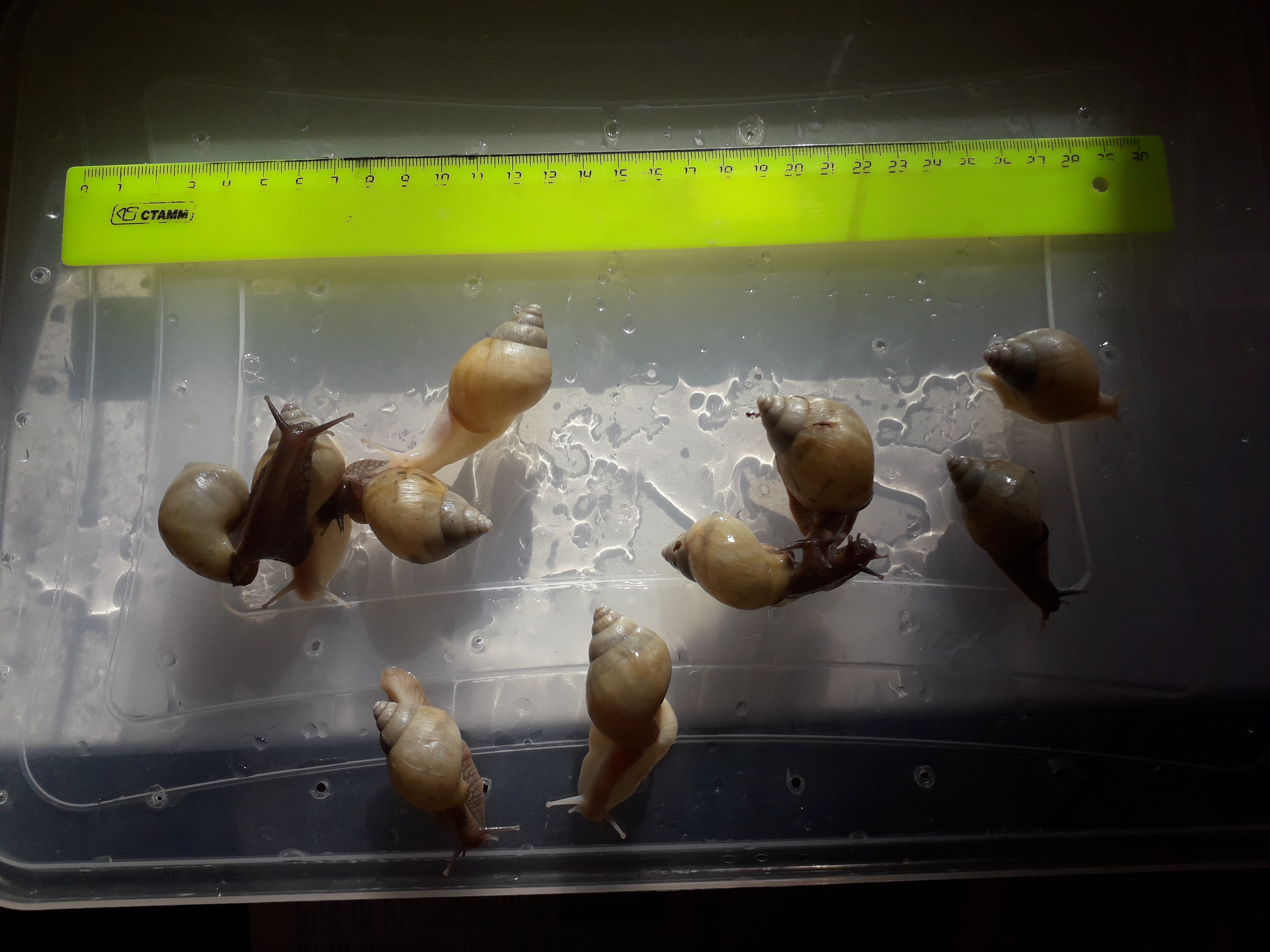 Меняю пару улиток на приличную шоколадку типа Milka или хорошие яблоки типа Голден. Отдаю некрупных улиток из тех, что видно на фото - светлая ракушка, тельце тёмное или белое (альбиносы). Есть еще малыши-альбиносы с тигровой окраской ракушки (ее длина 2-3 см) - их отдам 3 шт за шоколадку\яблоки. Крупные улитки - это родители, на фото для сравнения, их не отдаю. Улитки уже подросшие - на начало мая 2020 раковина 4-6 см., возраст 5 месяцев. При правильном уходе вырастут минимум втрое. Подробно с деталями рациона, содержания и прочее можно ознакомиться в Интернете. Забирать на Красном, остановка Юность.