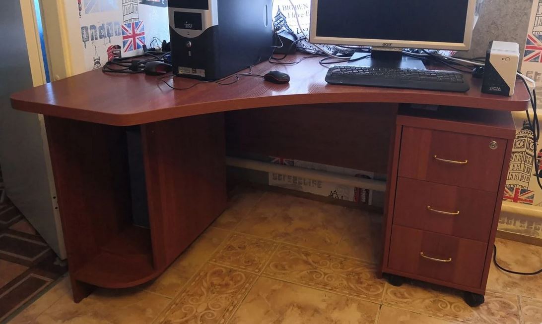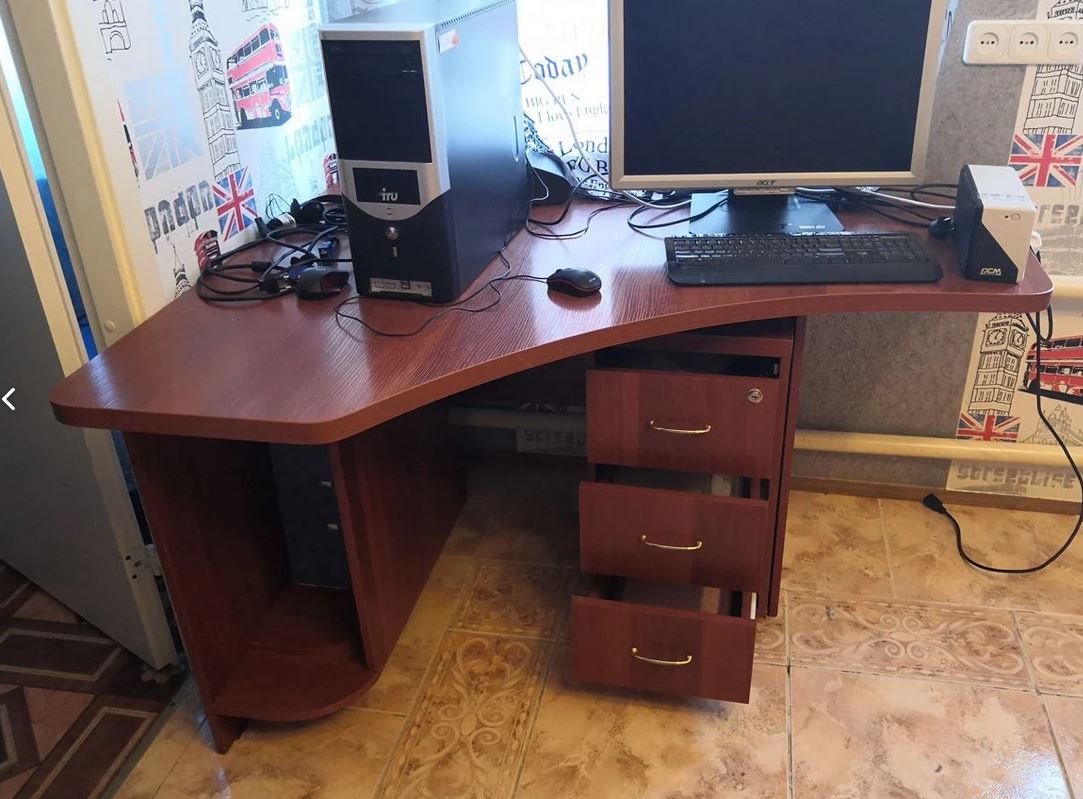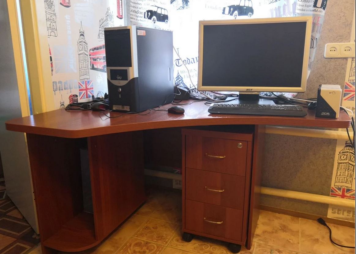 Продаю угловой компьютерный стол с выкатной тумбочкой. Б/у, в отличном состоянии. Общая длина стола 1400см. Ширина короткой части 510, длинной - 1030. Размеры тумбочки 350х400х660. Цена 2000р. Забирать самовывозом с Ангарского, Дзержинский район, остановка 82я школа. Торг.