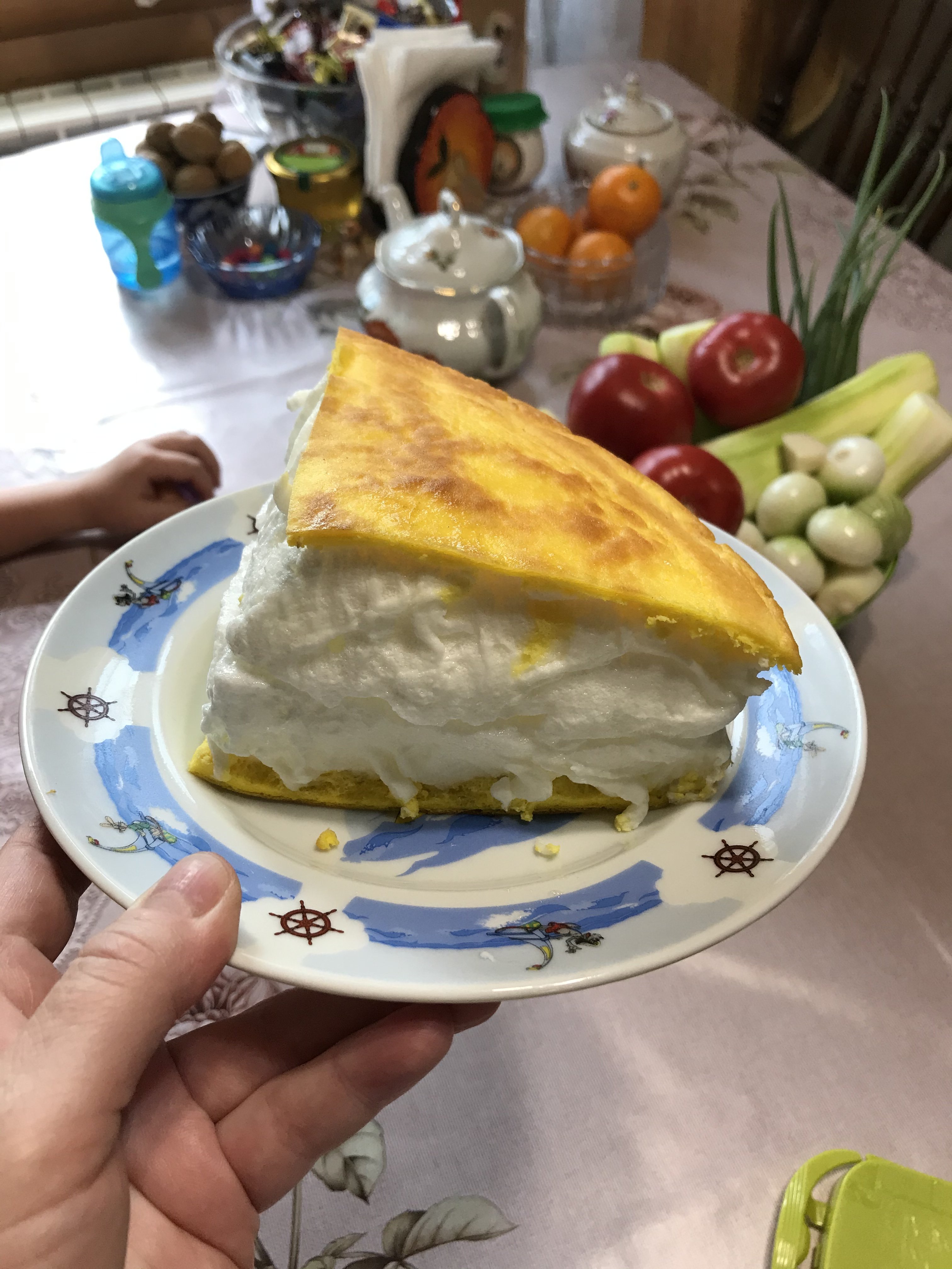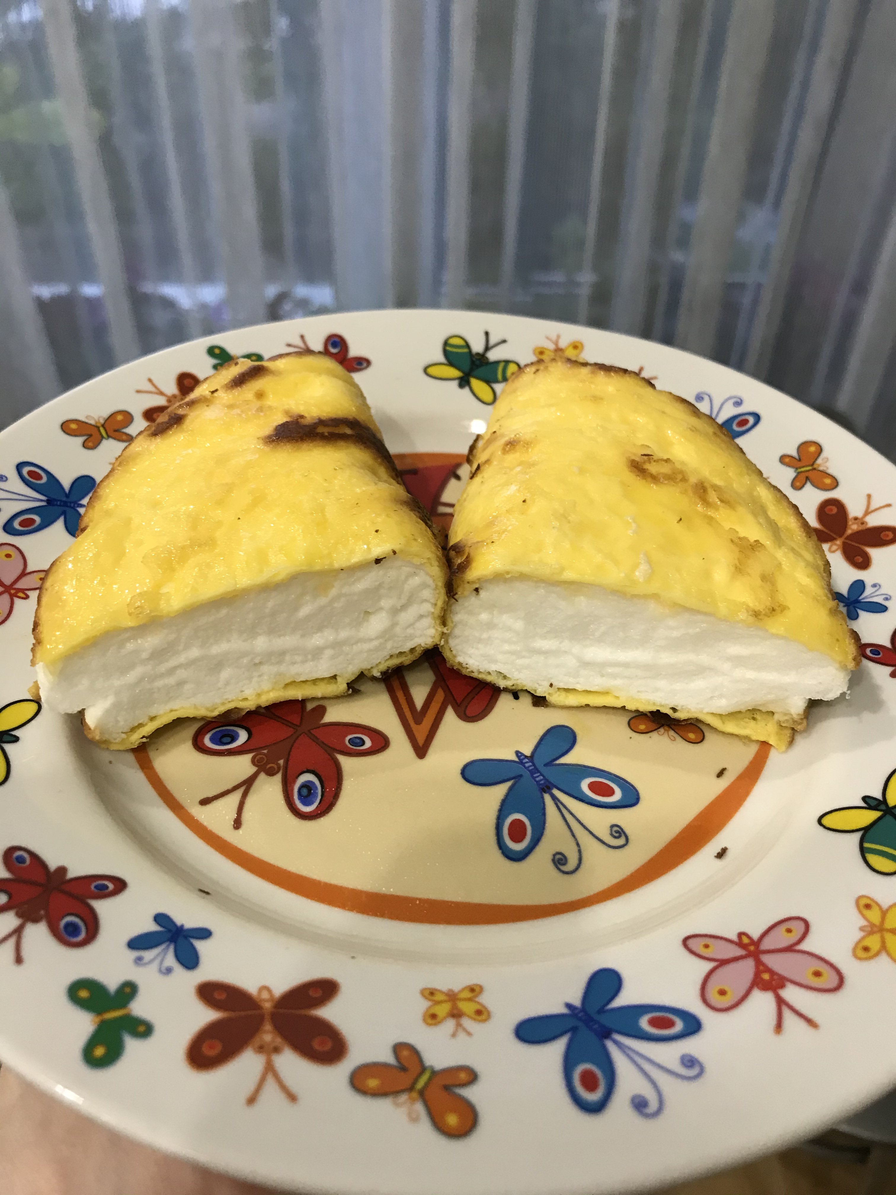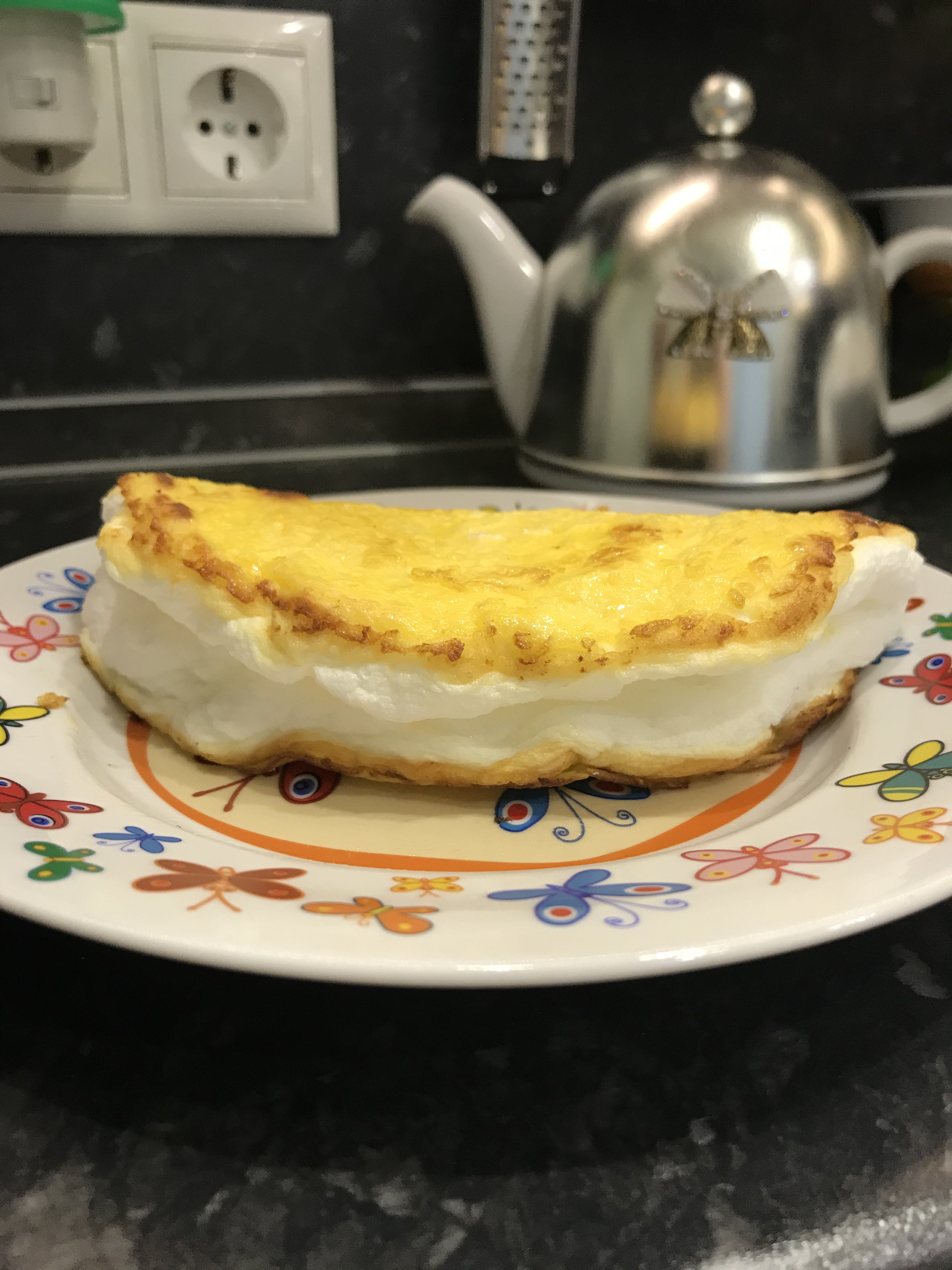 Яйца заслуживают отдельной темы) Рецептов яичницы много. Но начну с омлета. Сегодня впервые готовила омлет Пуляр. Два раза пришлось готовить, дочь добавки попросила)) Желток отделить от белка. Желток чуть посолить, добавить немного молока/сливок (~ 1-2ст.л), хорошо размешать, я вилкой перемешала. Белок чуть посолить, взбить миксером в пышную пену до крепких пик. На сковороду, я на сливочном масле, выливаем желток, огонь не большой, на желток сразу выкладываем белок и разравниваем, накрываем крышкой, минута две и готово. Гуглила рецепты, где-то пишут не надо накрывать крышкой. Буду пробовать разные варианты. Заодно набьётся рука на красивее и ровнее.