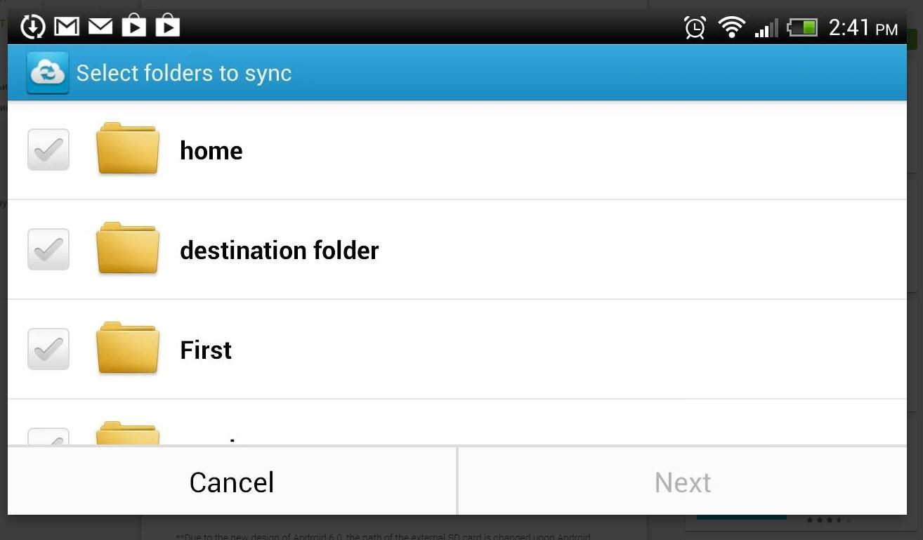 В приложении выбираешь папки которые нужно синхронизировать. Приложение само закидывает содержимое в хранилище по папкам. При желании можно и по sftp настроить синхронизацию: FolderSync - 4PDA https://play.google.com/store/apps/details?id=dk.tacit.android.foldersync.lite&hl=ru