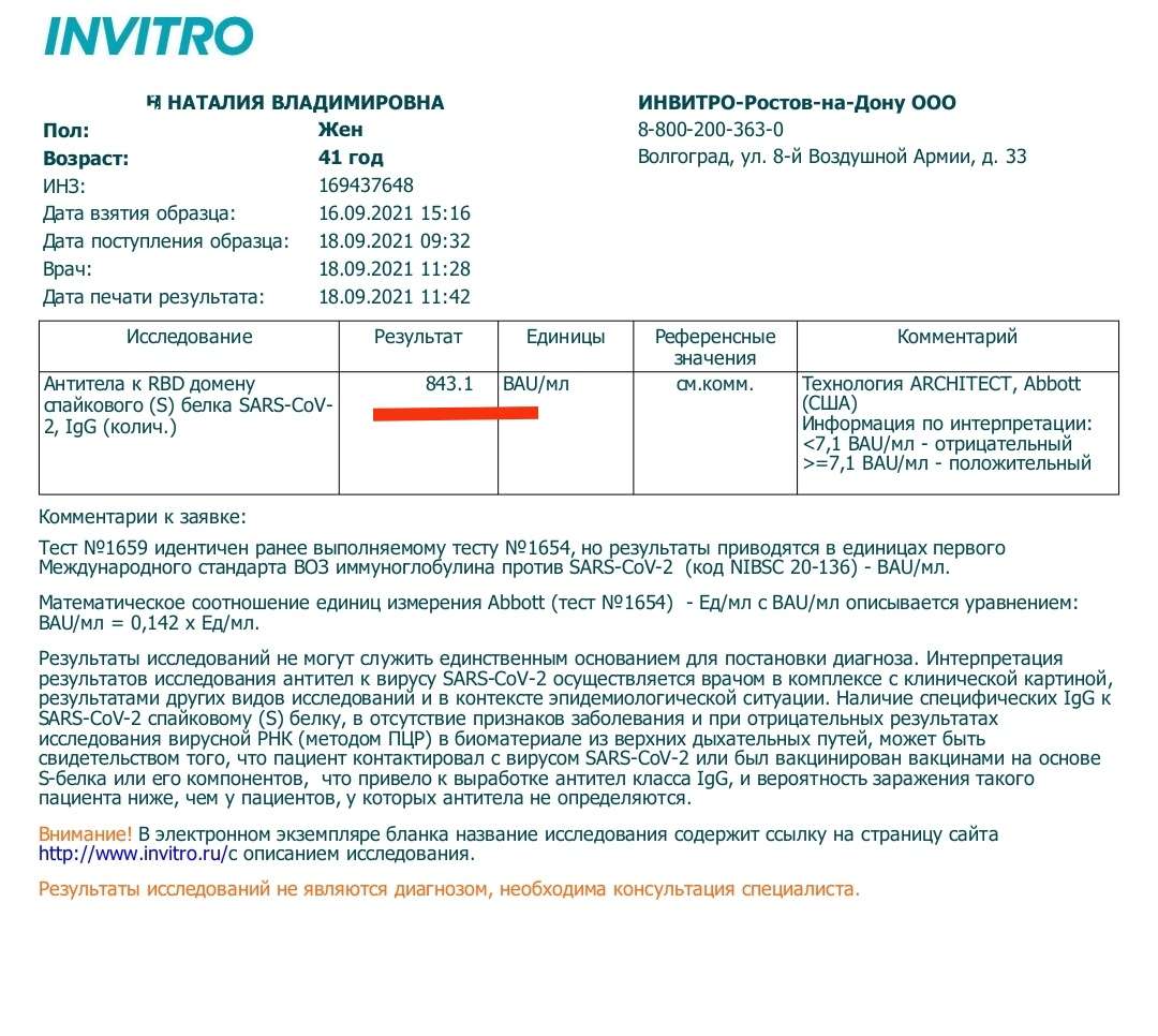 Да, течение болезни было тяжелым. 75% поражения легких. Возможно вы правы и кол-во антител напрямую зависит от течения болезни, но все же есть некие сомнения. Например: Сравнил результаты тестов моих родителей У мамы, которая очень, очень легко переболела ковидом(не подтвержден) после 6 мес анализ показал наличие антител в размере 254 au/ml, значит ковидом болела. У отца, который перенес ковид(не подтвержден) средне-тяжело, после 6 мес анализ показал наличие антител в размере 478 au/ml, значит ковидом болел, более того пропали запахи на месяц во время болезни. У меня, ковид подтвержденный и в тяжелом течении, после 6 мес, как я писал ранее 874 au/ml Далее, идем все прививаться V1 в июле. На начало августа - запланирован V2, я перед V2 сдаю анализ, который показал 4517 Bau/ml - 31810 au/ml Я отказался идти прививаться V2, родители пошли и привились и в результате: Тест у мамы показал 810 Bau/ml - 5705 au/ml Тест у папы показал 770 Bau/ml - 5422 au/ml Странно, да? Мама, которая очень легко перенесла ковид и первый тест показал 254 au/ml, после прививки v1, v2 имеет более высокий титр, чем у отца, хотя у отца после первый тест показал почти в два раза больше антител, а после v1,v2 у него антител немногим меньше чем у мамы. Ну а у меня это вообще жесть. Терминатор какой -то Сам офигел) Сдавал в KDL. Тест количественный, США (Abbott) - Антитела lgG к RBD домену S 1 белка коронавируса SARS-Cov2
