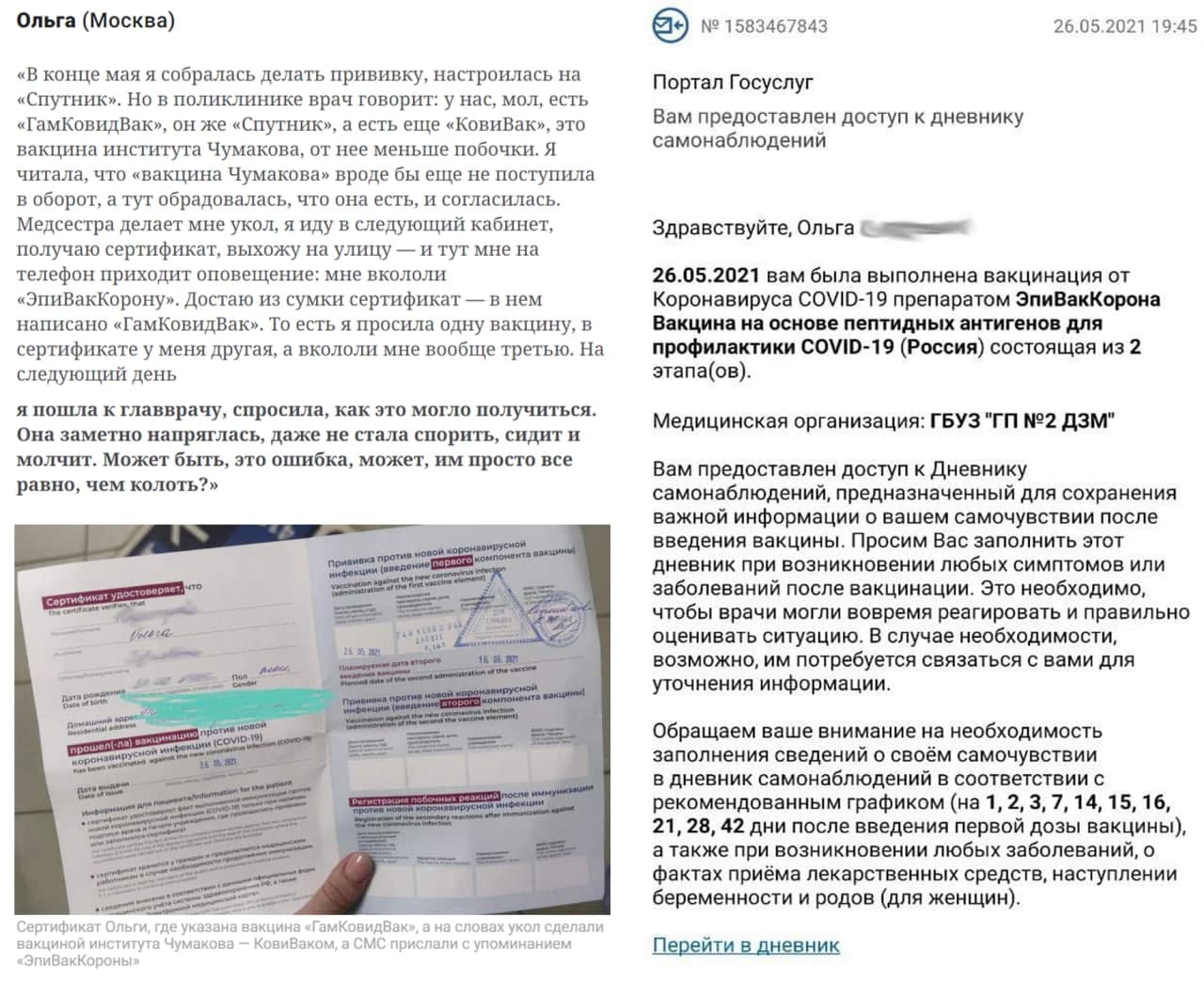 Новая газета - Novayagazeta.ru "ЭпиВакАфера В прививочных кабинетах начали заменять вакцину «Спутник» препаратом «ЭпиВакКорона», не предупреждая пациентов Добровольно-принудительная вакцинация, судя по рассказам пациентов и врачей, в России негласно началась. Об этом говорят люди, которые пришли в прививочные кабинеты добровольно, но там вместо выбранной вакцины получили «ЭпиВакКорону». С вопросом «Что теперь делать?» они обратились в группу добровольцев — исследователей вакцины, а потом некоторые из них рассказали свои истории «Новой». Нам известны их имена, рассказы они подтвердили бумагами, многие готовы идти в суды, считая, что их здоровью мог быть нанесен ущерб. Поэтому мы не просто поговорили с ними, но и попросили юриста прокомментировать ситуацию."