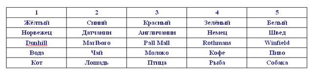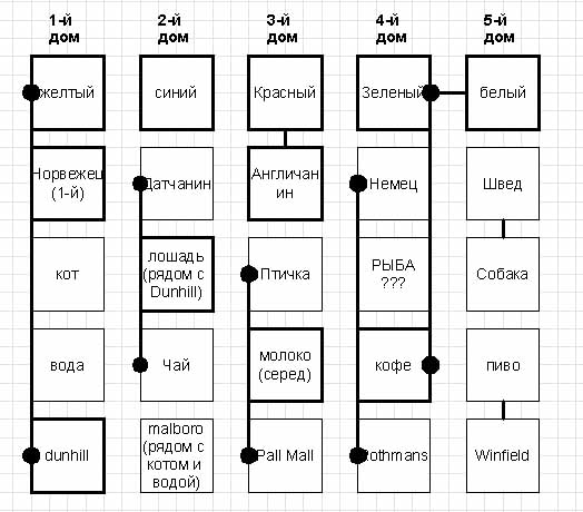 Альберт Эйнштейн придумал эту загадку в начале прошлого столетия. Он полагал, что 98% людей не смогут решить ее. Пропорция 98/2 с тех пор не изменилась. Узнайте, принадлежите ли Вы к этим гениальным 2 процентам? 1. Есть пять домов разного цвета: красный, зеленый, белый, желтый и синий; 2. Каждый населен человеком разной национальности: Немец, Швед, Датчанин, Норвежец и Англичанин; 3. Каждый из них пьет один вид напитков, курит одну марку сигарет и держит одно домашнее животное; 4. Каждый из них уникален в пределах группы (напиток, марка сигарет, животное не повторяются!); Вопрос: Кто держит рыбку? В Ваших поисках Вам помогут следующие ключи: 1. Англичанин живет в красном доме; 2. Швед держит собаку; 3. Датчанин пьет чай; 4. Зеленый дом налево от белого и ... 5. ...его жилец пьет кофе; 6 Курильщик Pall Mall держит птичку; 7. Жилец дома, находящегося в середине пьет молоко; 8. Жилец желтого дома курит Dunhill; 9. Норвежец живет в первом доме; 10. Курильщик Marlboro живет рядом с владельцем кота; 11. Владелец лошади живет рядом с курильщиком Dunhill; 12. Курильщик Winfield пьет пиво; 13. Дом Норвежца - рядом с синим домом; 14. Немец курит Rothmans; 15. Курильщик Marlboro живет рядом с тем, кто пьет воду. P.S. Я корпел над этой задачей челых 35 минут!!! Но в конце концо решил ее. По сути это обычный пазл, который нужно сложить... Но всеравно прияно, что я попал в 2% P.P.S Те кто уже знают ответ (либо сами решили, либо где-то прочитали) ОГРОМНАЯ прозьба - не выкладывать его, пусть те кто не знают, попробуют сами решить...