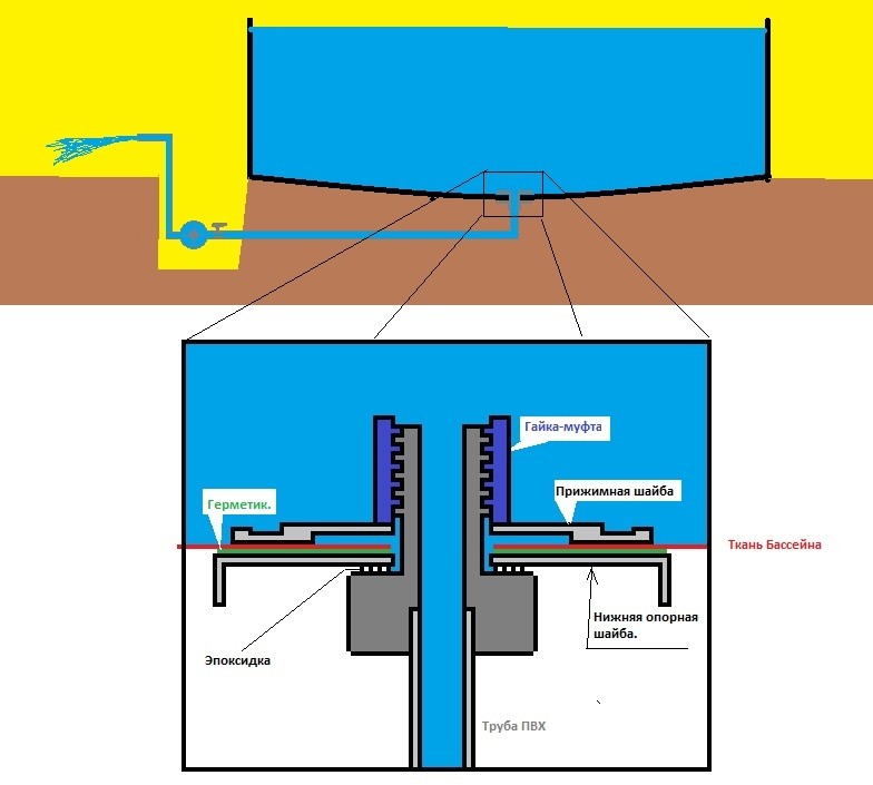 Я делал отверстие в дне каркасника. В самом низком месте дна. Если каркасник круглый, то лучше по центру. Диаметром 1 дюйм. Под дном бассейна проложена труба ПВХ на 32мм. Оголовок с резьбой на который герметично зажимается материал бассейна. Сливается фактически все. В качестве насоса - используется повысительный насос от систем отопления, который ниже уровня бассейна в приямке.