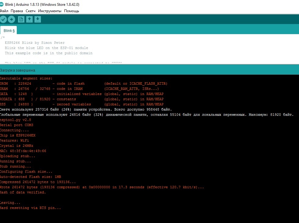 Занялся тут изучать Arduino. Купил ESP8266. Телефон видит WiFi. Купил USB-адаптер. Перемычку сделал для прошивки. Вроде как шьется. Но не работает. Не мигает светодиод почему то. И АТ команды в мониторе порта никакого ответа не имеют. В чем может быть дело?