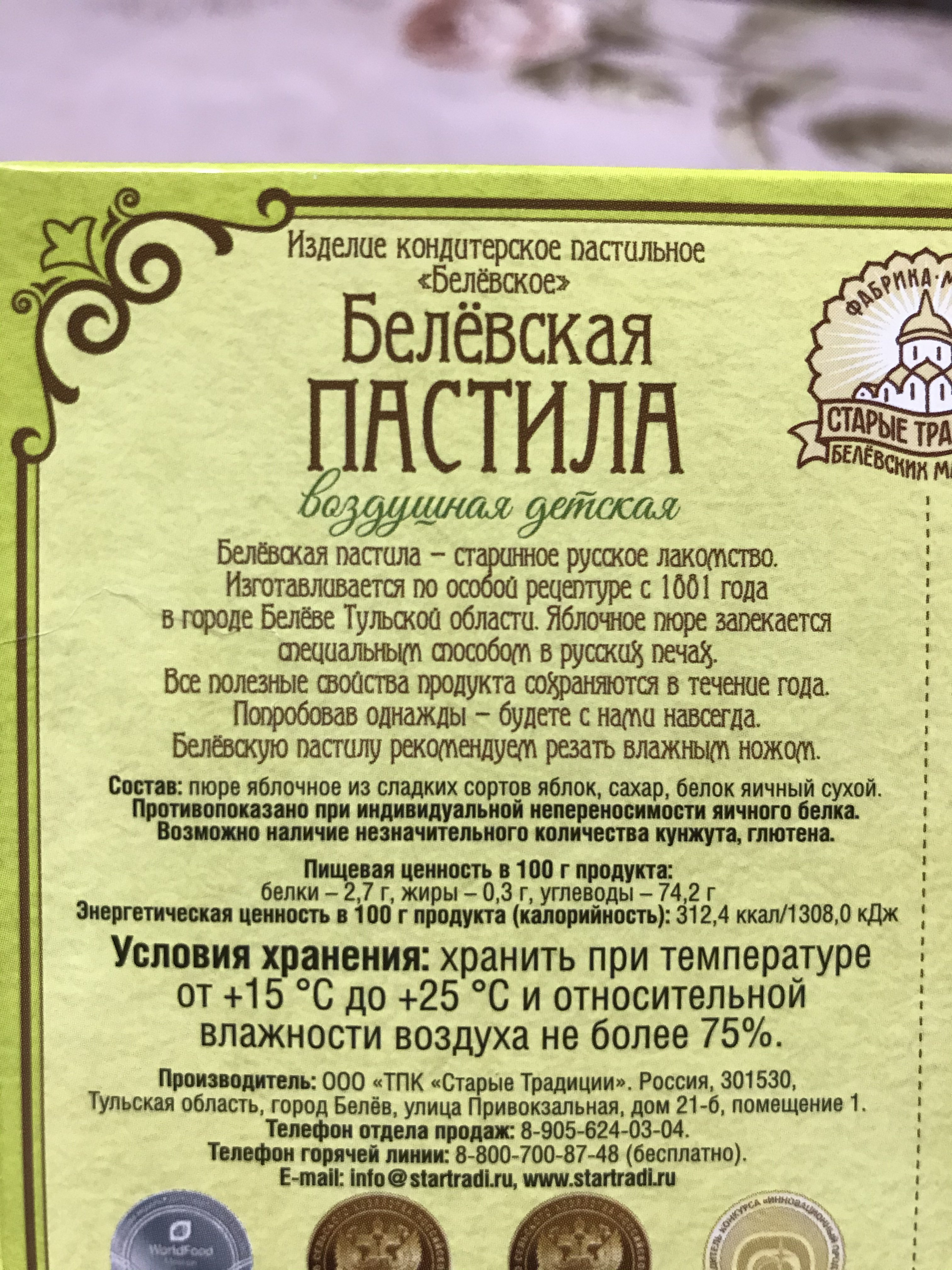 Белёвская пастила. При покупке, обращайте внимание на производителя. На слуху слово «белёвская» которое и написано большими буквами, увидев его, берём пастилу, её же, белёвскую, все хвалят. Идём радостные домой, кусаем и тут фиаско, кислятина!)) А почему? Потому что, есть разные производители и вкус разный. Вкусная у производителя «Старые традиции» мои фото на столе. У бренда «Традиции Белёва» пастила кислая бррр, фото прямоугольной коробки.