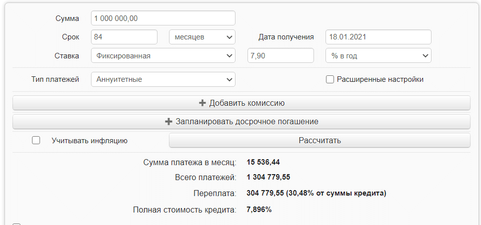это немного разные вещи. Страховка потреб кредита включена в тело кредита. Из расчетов выше (там, где лям на 84 месяца под 7,9%) вполне понятна сумма. Вот реальный платеж под 7,9% без страхования: Итого получается 2874 рубля в месяц, или 34488 рублей в год, или 241416 рублей за 7 лет)