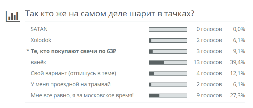 Промежуточные итоги. @ванёк побеждает. С отрывом в 4 голоса от клятых москалей выцарапывает звание "шарящего в тачках" Поздравляем!)