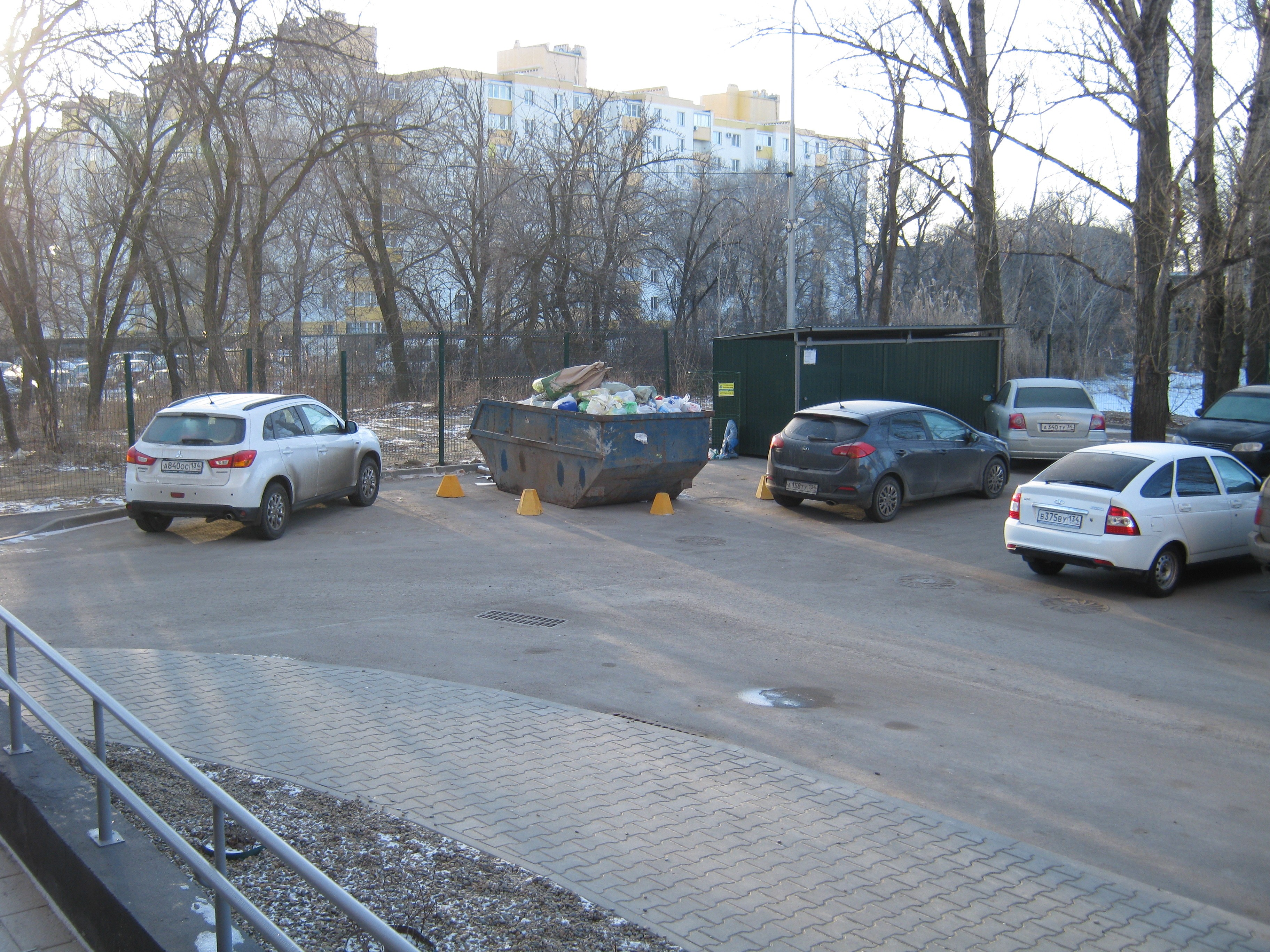 Три стандартных контейнера для бытовых отходов. Большое корыто же, привозили на первом году заселения, для строительно-отделочного мусора. А мусоропровод до сих пор "прихвачен". И это хорошо.