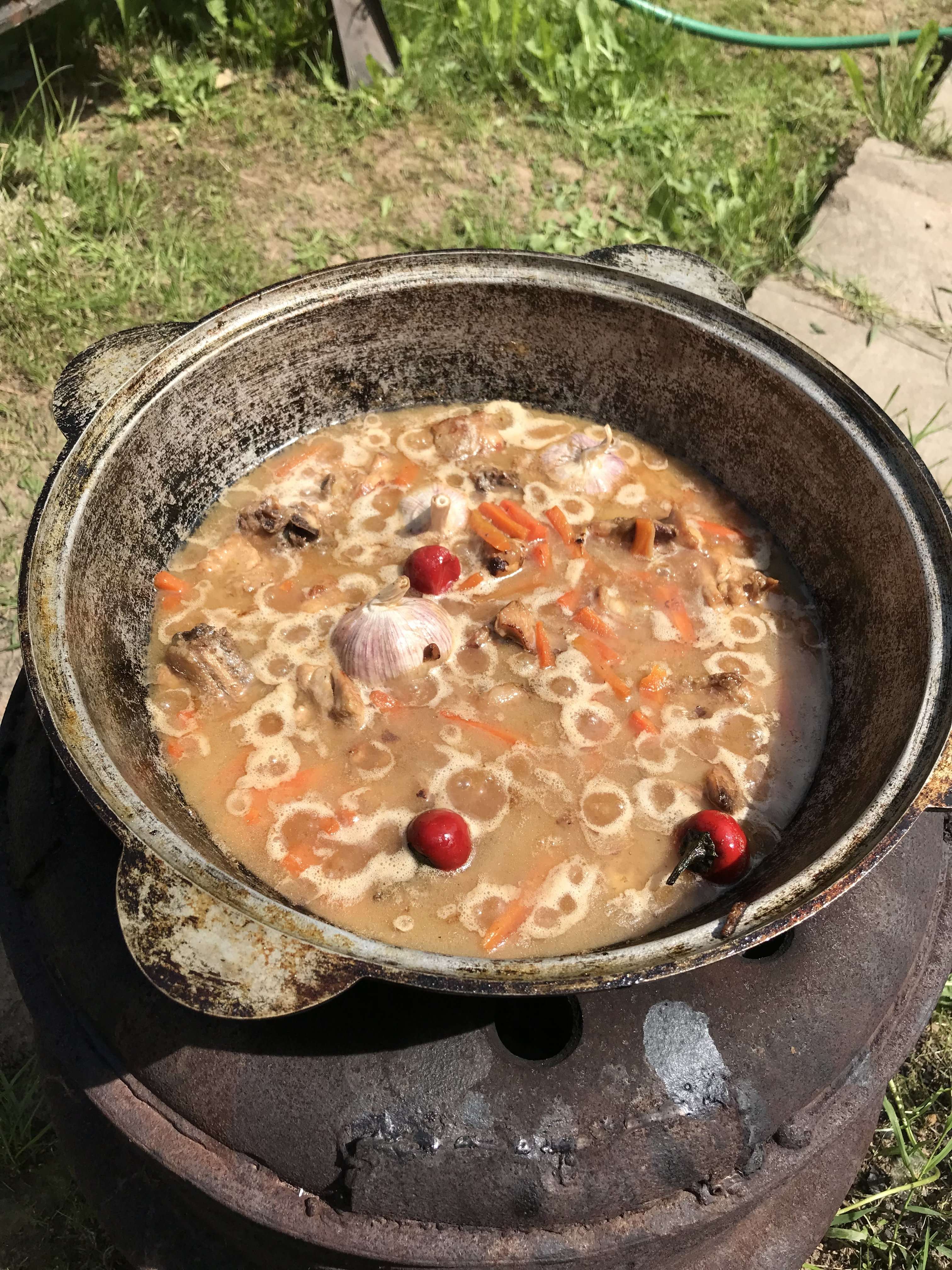 Ведро картофеля)) Сначала картофель обжарила во фритюре, в котелке это делала. Потом в казане мясо, лук с морковкой, грибы. Сверху картофель, овощи, специи и под крышку до готовности. 27.09.23