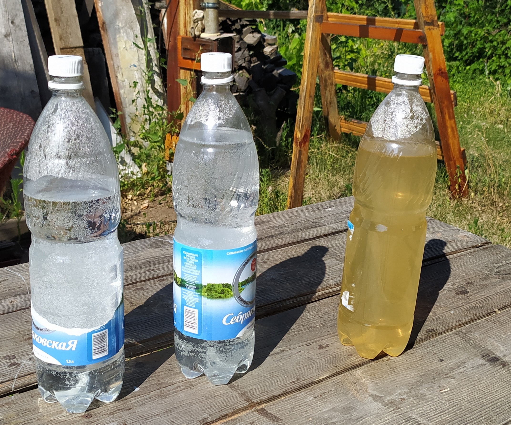 Я тут как то спрашивал, как обезжелезить воду из скважины на даче. По совету человека поставил фильтр такой, набрал бутылку из под крана и непосредственно из скважины. Через 8 часов получилось то, что на фото. Бутылки слева - до промывки фильтра, после промывки (разницы нет).