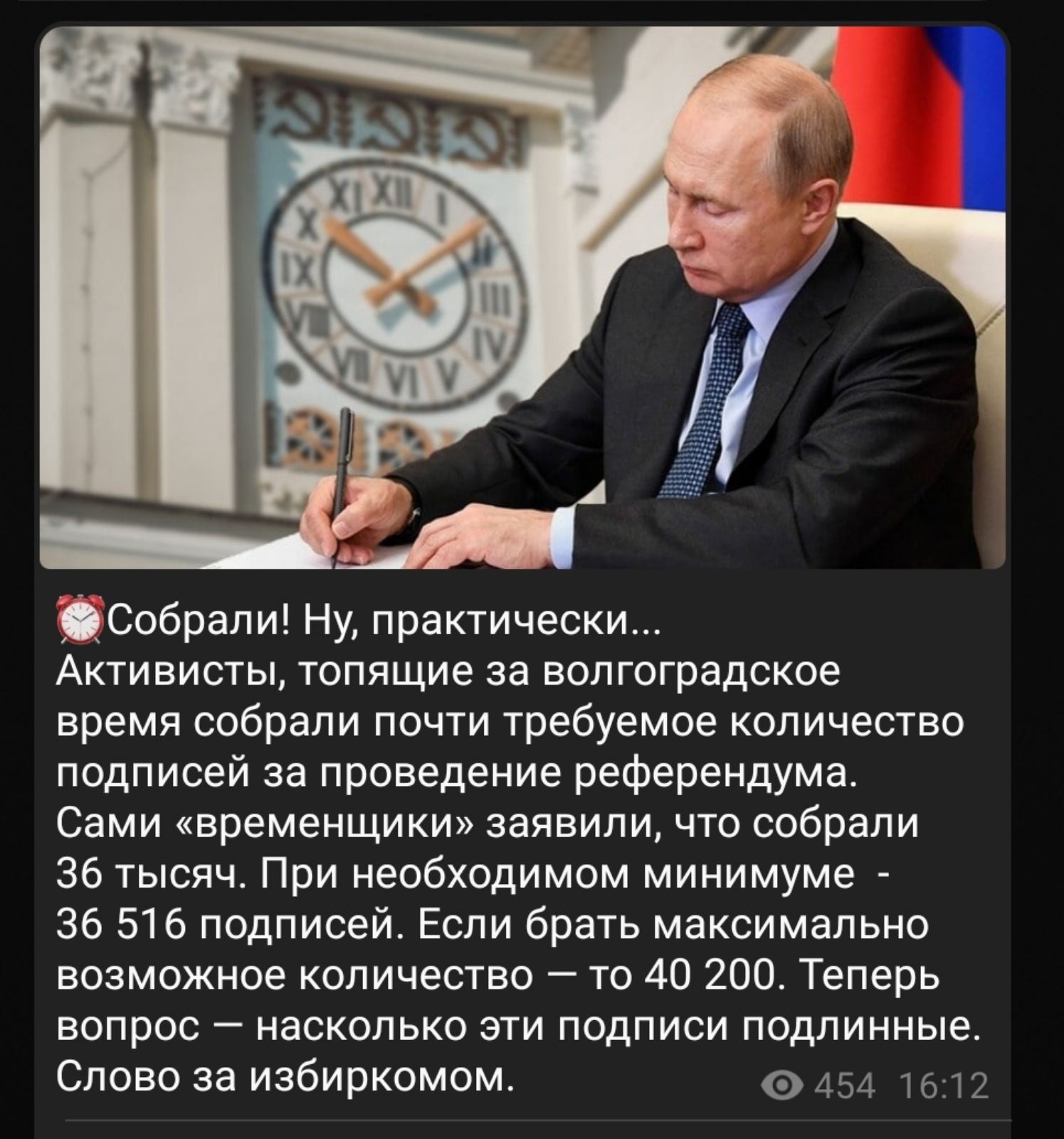Сторонникам волгоградского времени осталось собрать 3,7 тысячи подписей за проведение референдума