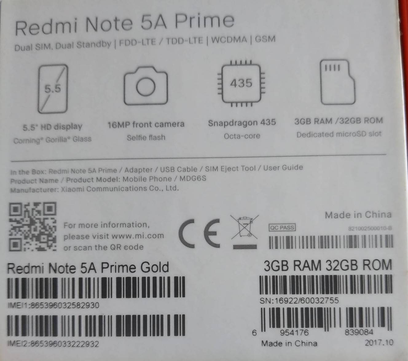 Продаю телефон Redmi Note 5A Prime 3/32 Gb золотой, б\у в отличном состоянии. Отличный вариант для детей и любителей селфи. Передняя камера 16Gb со вспышкой! Слот на 2 SIM-карты и карту памяти. Установлена новая MUI 11. АКБ держит около суток при включенном Интернете. Использовался с защитным стеклом и чехлом с покупки. Без сколов и дефектов. Не вскрывался. Полный комплект. Чехол-книжка в подарок. Qualcomm Snapdragon 435, 8 ядер Cortex-A53 (4@1,4 ГГц + 4@1,1 ГГц) GPU Adreno 505 @450 МГц Сенсорный дисплей IPS 5,5″, 1280×720, 267 ppi Оперативная память (RAM) 3ГБ, внутренняя память 32ГБ Поддержка Nano-SIM (2 шт.) Поддержка microSD до 128 ГБ Bluetooth 4.2 Micro-USB, USB OTG GPS, A-GPS, Глонасс, BeiDou Основная камера 13 Мп, f/2,2, автофокус, 1080p-видео Фронтальная камера 16 Мп, f/2,0, фикс.фокус, LED-вспышка Датчики приближения и освещения, магнитометр, акселерометр, гироскоп, детектор шага Сканер отпечатков пальцев ИК-порт Аккумулятор 3080 мА·ч Размеры 153×76×7,7 мм Масса 153 г Цена: 5500р. Тел: 8~9O~23*6OО~329