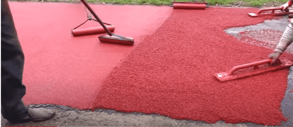 Таким покрытием закатывают спортивные площадки. Вон парк напротив стадиона дорожки замучены. Делали такие в области в 3х населенных пунктах. Уже 5 лет прошло. Сама мастика разводится на месте миксером, связующее вещество (типа клея не помню название) наносится на бетонное основание и мастика в жидком состоянии распределяется равномерно по уровню. Потом соответственно сохнет.