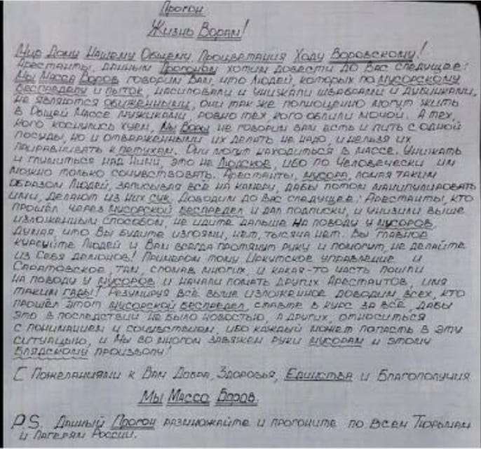 15 декабря по российским колониям разошелся «прогон», в котором авторитеты объяснили осужденным, что нельзя идти на поводу у ФСИН и понижать в иерархии тех, кого администрация колоний пытала или насиловала. «Они не являются "обиженными" и также полноценно могут жить в общей массе», — говорится в письме.