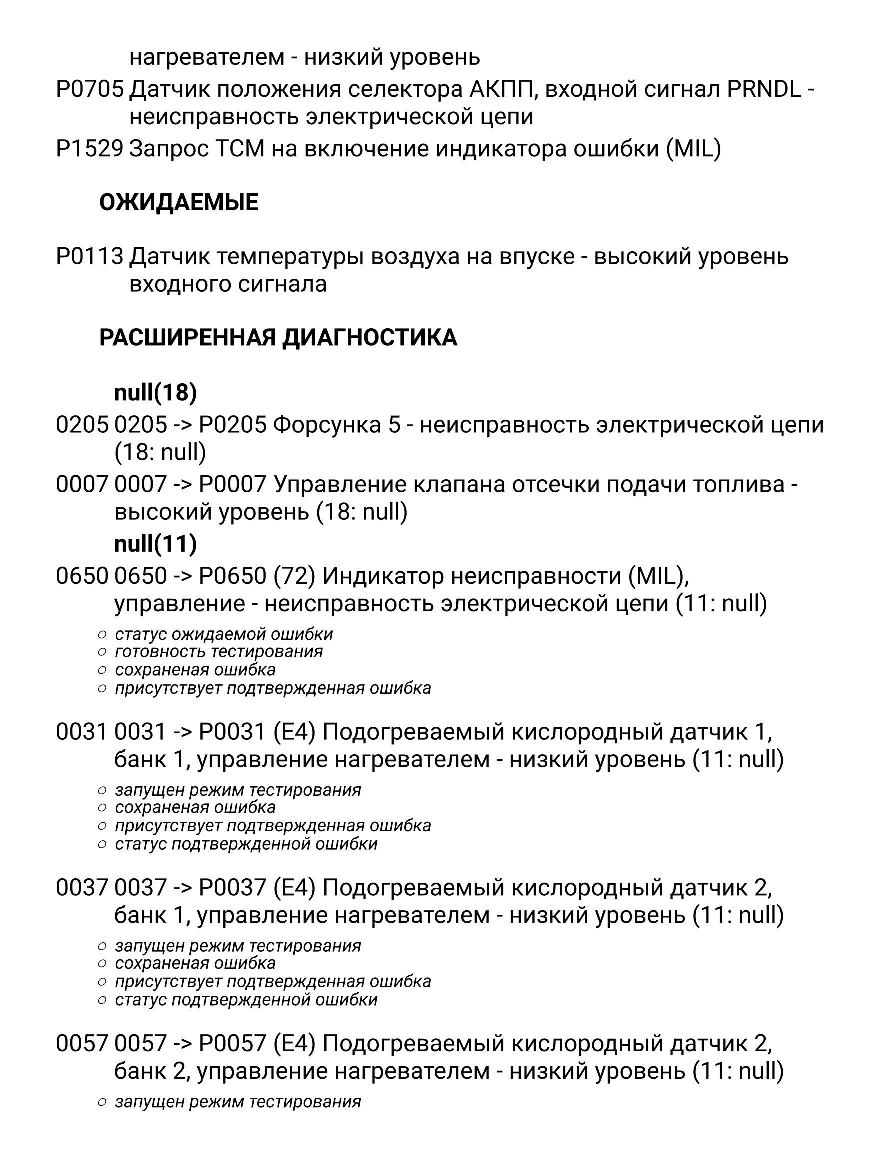 Статус: Временная неисправность присутствовала в текущем цикле, Проверка не завершена, Подтвержденная ошибка сохранена в энергонезависимой памяти, Подтвержденная ошибка присутствует во время запроса