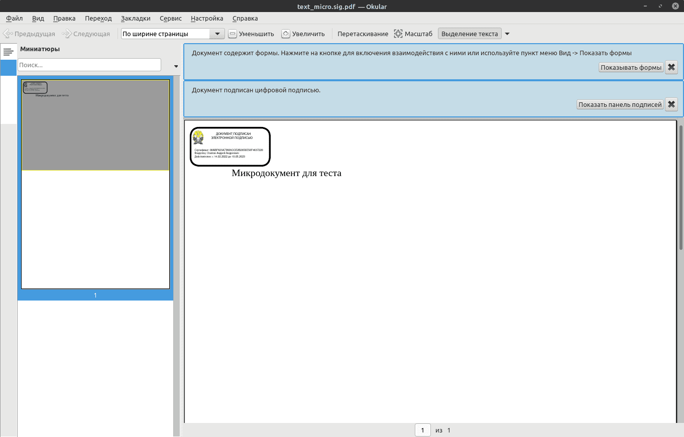 Ну, яхз, pdfinfo вот это пишет: Код: $ pdfinfo text_micro.pdf ... Form: none ... Код: $ pdfinfo text_micro.sig.pdf ... Form: AcroForm ... Тестовые простейшие пдф-ки с короткой фразой, исходная и с подписью. Окуляр: