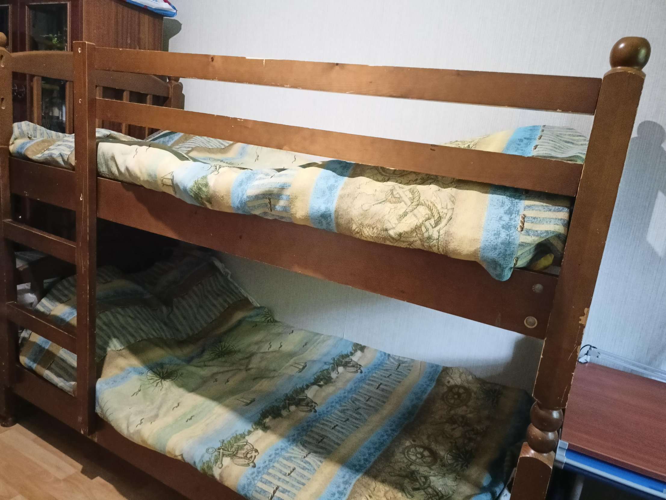 Деревянная Легко разбирается на 2 полноценные кровати Подойдет как детям так и взрослым Размеры Внешние: 208 на 89 (матрас 80 на 190) Внешне покорябана, крепления на месте, держит отлично, не шатается 7000 Торг