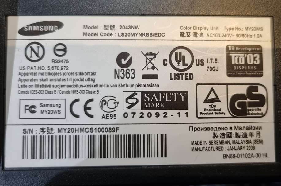 Монитор Samsung 2043NW тухнет через несколько сек после включения. без кабелей, старт пусть будет 500р. Аллея Героев.