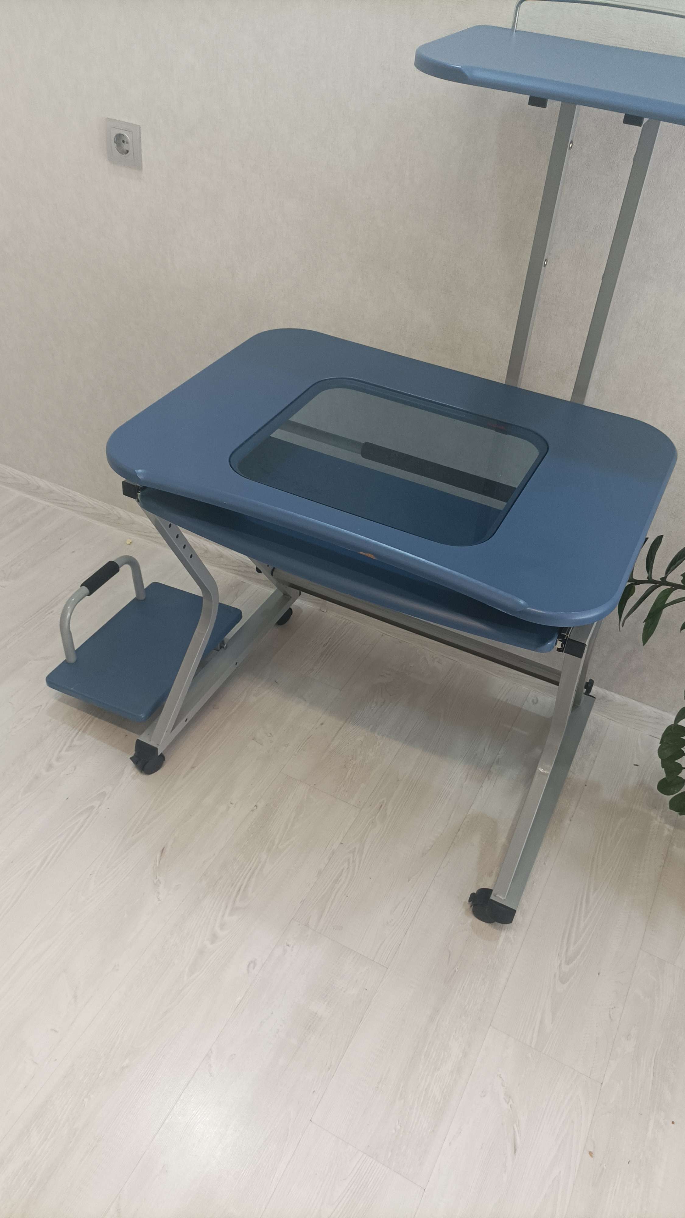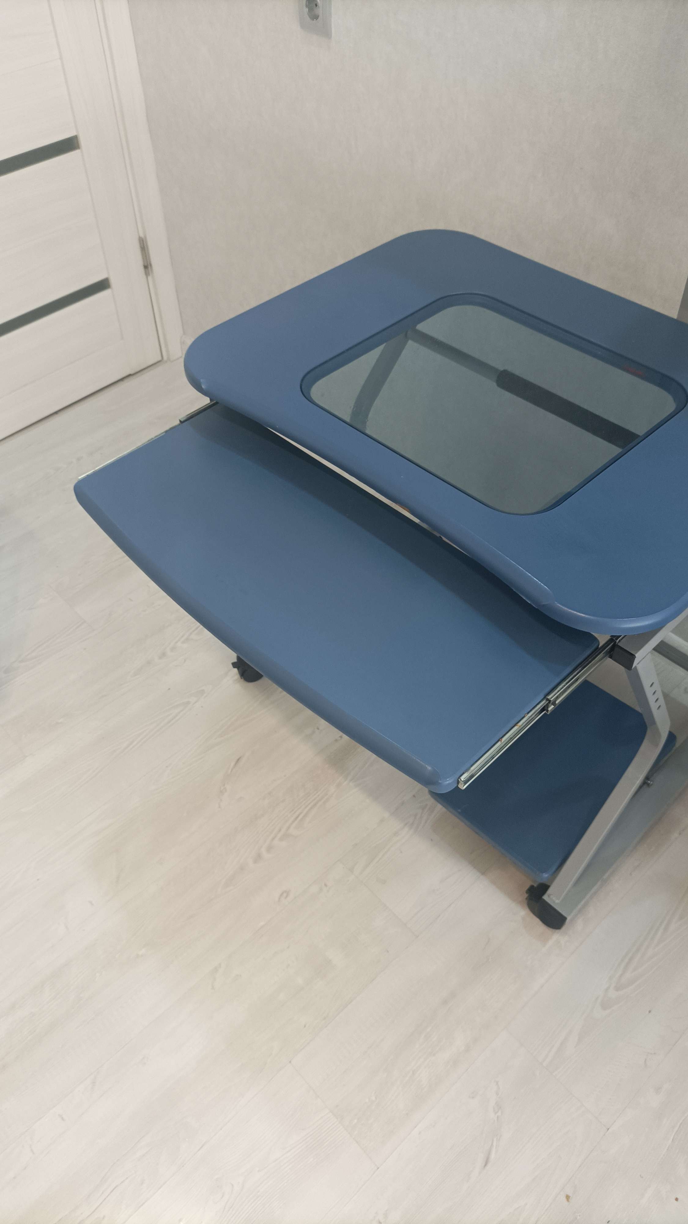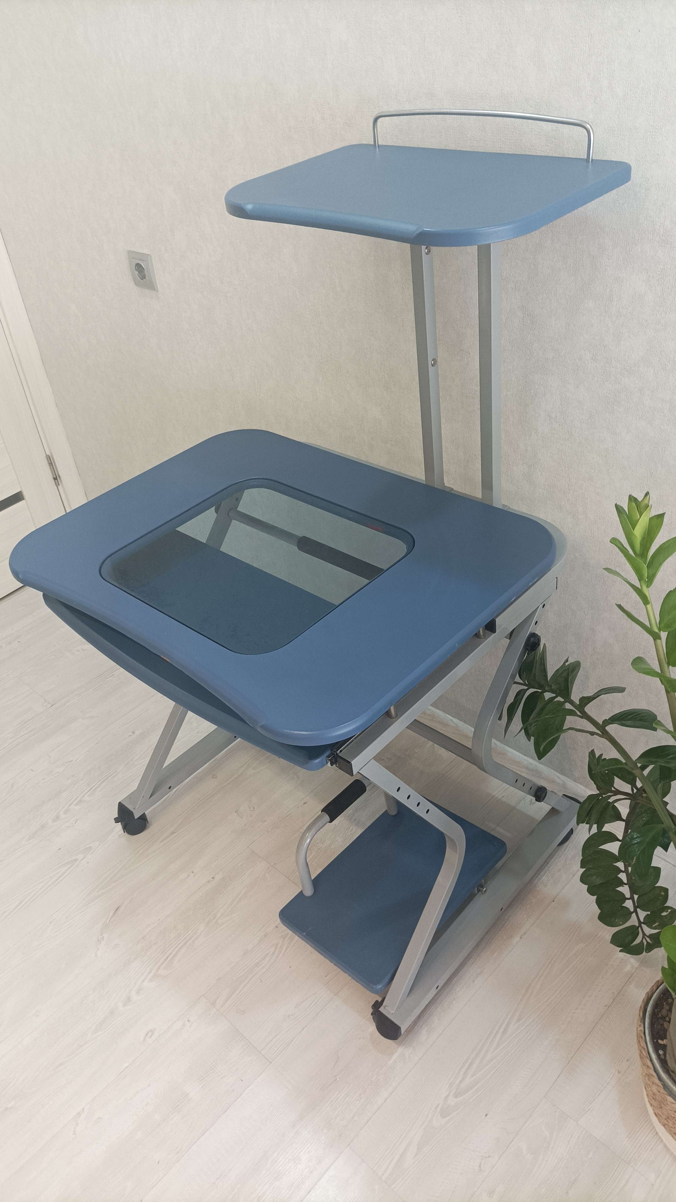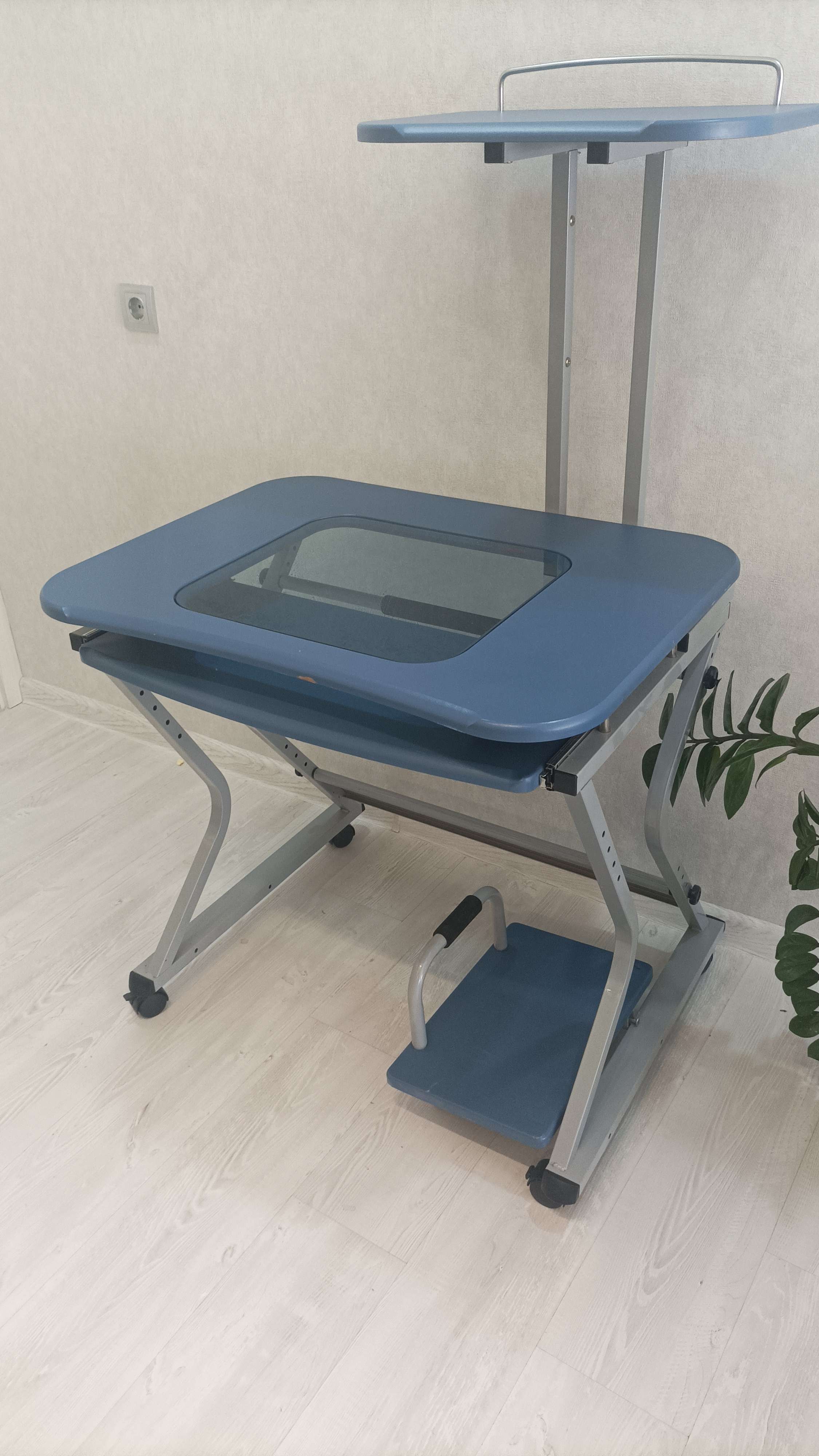 Удобный функциональный стол. Есть полки под принтер, системник, клавиатуру. Полка под принтер регулируется по высоте и по расположению, можно подвинуть в лево или право. Полка под системник может ставиться как внутрь так и наружу с любой стороны. Есть 2 дефекта на передней части, дети погрызли, но дальше не обдирается плëнка. Под принтером свободно помещается 27 дюймовый монитор. Ширина без подставки 80см, глубина 70см, высота от пола до верха столешницы 80см, для монитора высота 48см Блиц 3000. А в остальном можно поторговаться)