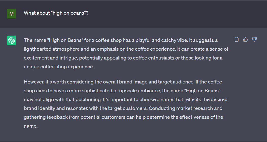 А вот немного в юмор, продолжая тему нейминга: Я: "Как насчёт "High on Beans"?" ("заторчавший на бобах", или хз как это лучше перевести (beans - и бобы, и кофейные зёрна)) ЧатГПТ: "Название «High on Beans» для кофейни имеет игривую и запоминающуюся атмосферу. Он предлагает беззаботную атмосферу и акцент на опыте употребления кофе. Это может создать ощущение волнения и интриги, потенциально привлекательное для энтузиастов кофе или тех, кто ищет уникальный опыт кофейни. Однако стоит учитывать общий имидж бренда и целевую аудиторию. Если кофейня стремится создать более изысканную или высококлассную атмосферу, название «High on Beans» может не соответствовать этому позиционированию. Важно выбрать имя, которое отражает желаемую идентичность бренда и находит отклик у целевых клиентов. Проведение маркетинговых исследований и сбор отзывов от потенциальных клиентов могут помочь определить эффективность названия" В контексте обсуждается чатгпт. Аналогов в плане диалогового опыта, чтобы обобщить до ИИ в целом, пока нет