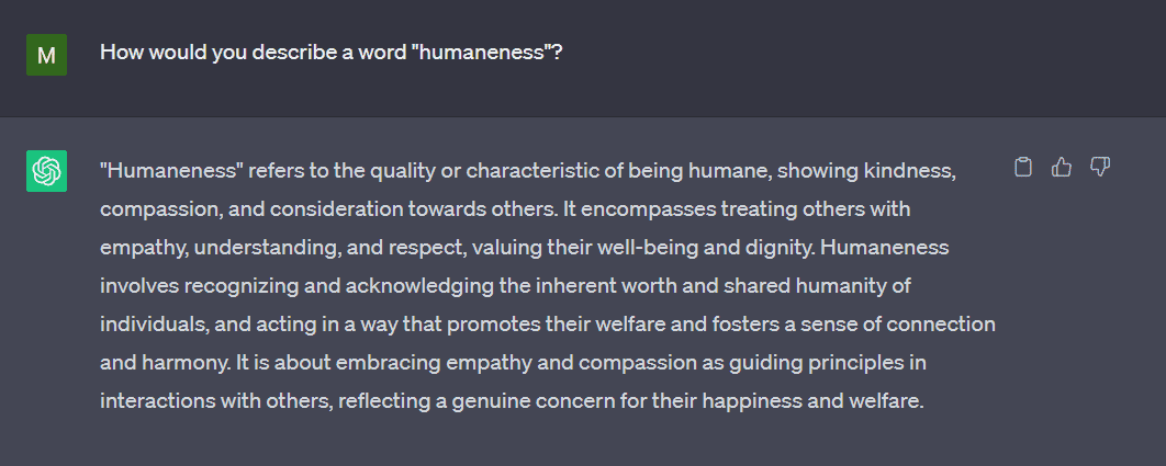 "Человечность" ни есть разум или способность мылить: гугл вам в помощь, хотя может у вас с ИИ свои формулировки на этот счет...кстати задайте вопрос ИИ : что такое человечность?