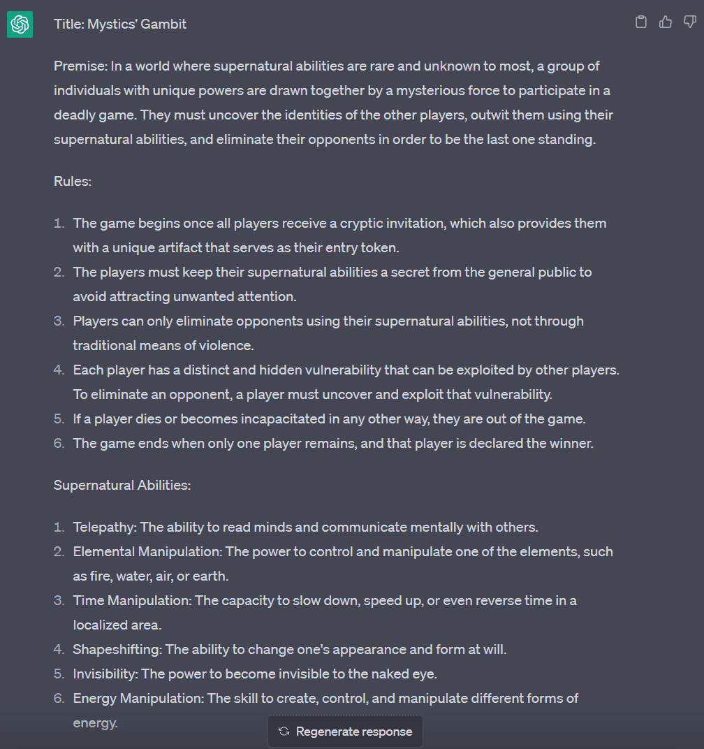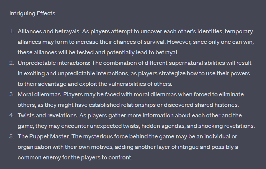А ещё можно попробовать предложить ему придумать правила магической войны, например. Типа есть люди, обладающие разными возможностями, и должны друг друга переиграть в магической войне. Собственно, вот что получилось (сорри за гугл транслейт): Название: Гамбит мистиков Предпосылка: В мире, где сверхъестественные способности редки и неизвестны большинству, группа людей с уникальными способностями объединяется таинственной силой, чтобы участвовать в смертельной игре. Они должны раскрыть личности других игроков, перехитрить их, используя свои сверхъестественные способности, и уничтожить своих противников, чтобы остаться последним выжившим. Правила: 1. Игра начинается, когда все игроки получают загадочное приглашение, которое также предоставляет им уникальный артефакт, который служит их жетоном входа. 2. Игроки должны держать свои сверхъестественные способности в секрете от широкой публики, чтобы не привлекать нежелательного внимания. 3. Игроки могут уничтожать противников только с помощью их сверхъестественных способностей, а не с помощью традиционных средств насилия. 4. У каждого игрока есть явная скрытая уязвимость, которой могут воспользоваться другие игроки. Чтобы устранить противника, игрок должен обнаружить и использовать эту уязвимость. 5. Если игрок умирает или каким-либо иным образом становится недееспособным, он выбывает из игры. 6. Игра заканчивается, когда остается только один игрок, и этот игрок объявляется победителем. Сверхъестественные способности: 1. Телепатия: способность читать мысли и мысленно общаться с другими. 2. Элементарное управление: способность контролировать и манипулировать одним из элементов, таким как огонь, вода, воздух или земля. 3. Управление временем: способность замедлять, ускорять или даже обращать время вспять в определенной области. 4. Изменение формы: способность изменять свой внешний вид и форму по желанию. 5. Невидимость: Способность становиться невидимым невооруженным глазом. 6. Управление энергией: умение создавать, контролировать и манипулировать различными формами энергии. Интригующие эффекты: 1. Союзы и предательства: когда игроки пытаются раскрыть личности друг друга, могут формироваться временные союзы, чтобы увеличить их шансы на выживание. Однако, поскольку победить может только один, эти союзы будут проверены и потенциально могут привести к предательству. 2. Непредсказуемые взаимодействия: сочетание различных сверхъестественных способностей приведет к захватывающим и непредсказуемым взаимодействиям, поскольку игроки разрабатывают стратегию, как использовать свои силы в своих интересах и использовать уязвимости других. 3. Моральные дилеммы. Игроки могут столкнуться с моральными дилеммами, когда вынуждены устранять других, поскольку у них могли быть установленные отношения или обнаруженные общие истории. 4. Неожиданные повороты и разоблачения. Собирая больше информации друг о друге и об игре, игроки могут столкнуться с неожиданными поворотами, скрытыми планами и шокирующими откровениями. 5. Хозяин Марионеток: Таинственная сила, стоящая за игрой, может быть человеком или организацией со своими собственными мотивами, добавляя еще один уровень интриги и, возможно, общего врага, с которым игроки могут столкнуться.