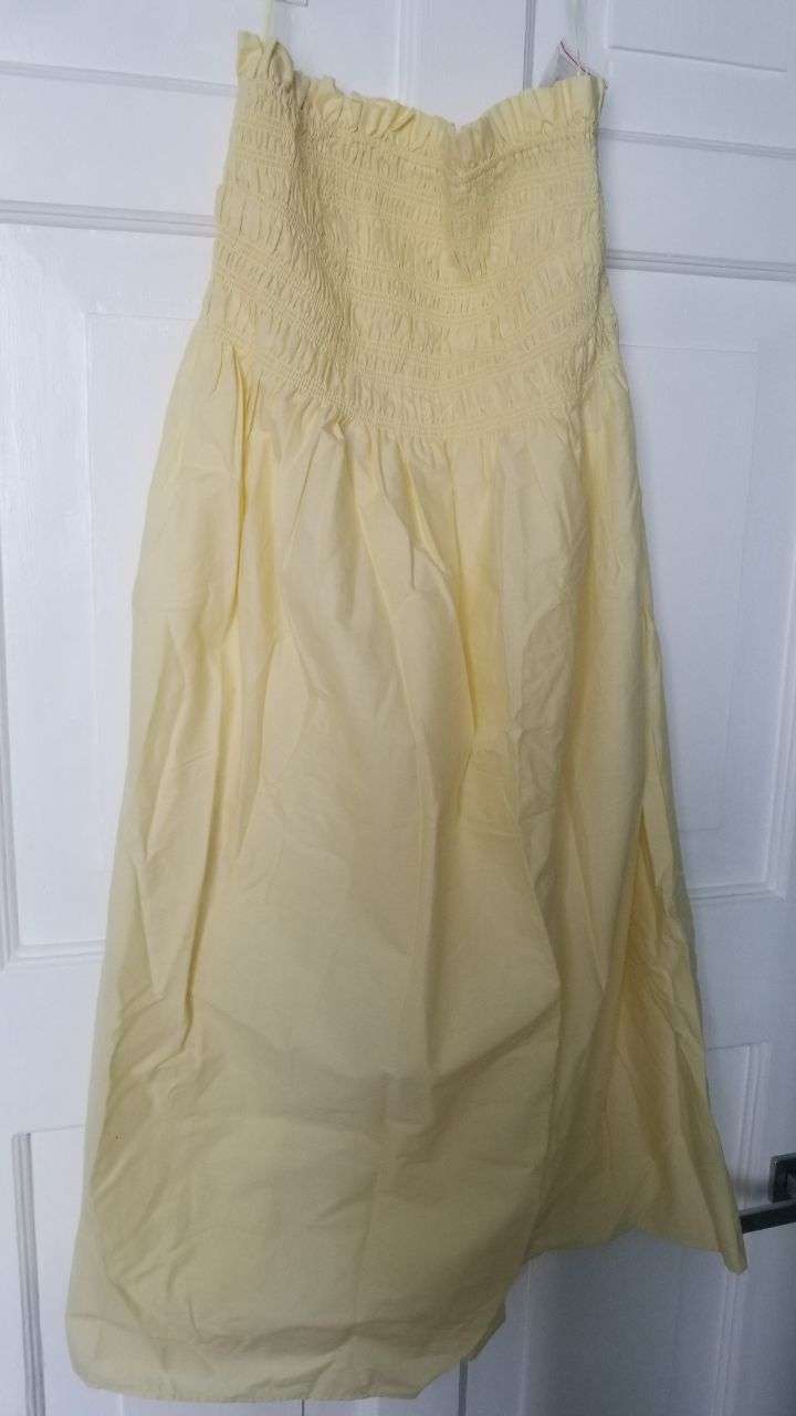 1,2 фото -платье рубашка H&M модного принта леопард. Платье с поясом, отрезное по талии, застежка сквозная скрытая, вырез углом. Написано размер М, большемерит, подойдет на 46-48. Состав - 100% вискоза. 3,4 фото - сарафан из плотного хлопка без блеска, держит форму, красивый пыльно-голубой цвет, трендовый фасон с завышенной талией и пышной юбкой, бренд collusion. Куплен на Asos. Размер указан 38, но большемерит, подойдет на 48 размер. 5,6 фото - сарафан H&M, цвет желтый, сверху собран на многорядную резинку. Есть тонкие лямки, 100% хлопок. Ткань плотная, но тонкая и легкая, сарафан держит форму. Написано размер L. Все платья по 1500р., все куплено в официальных магазинах до ухода брендов.