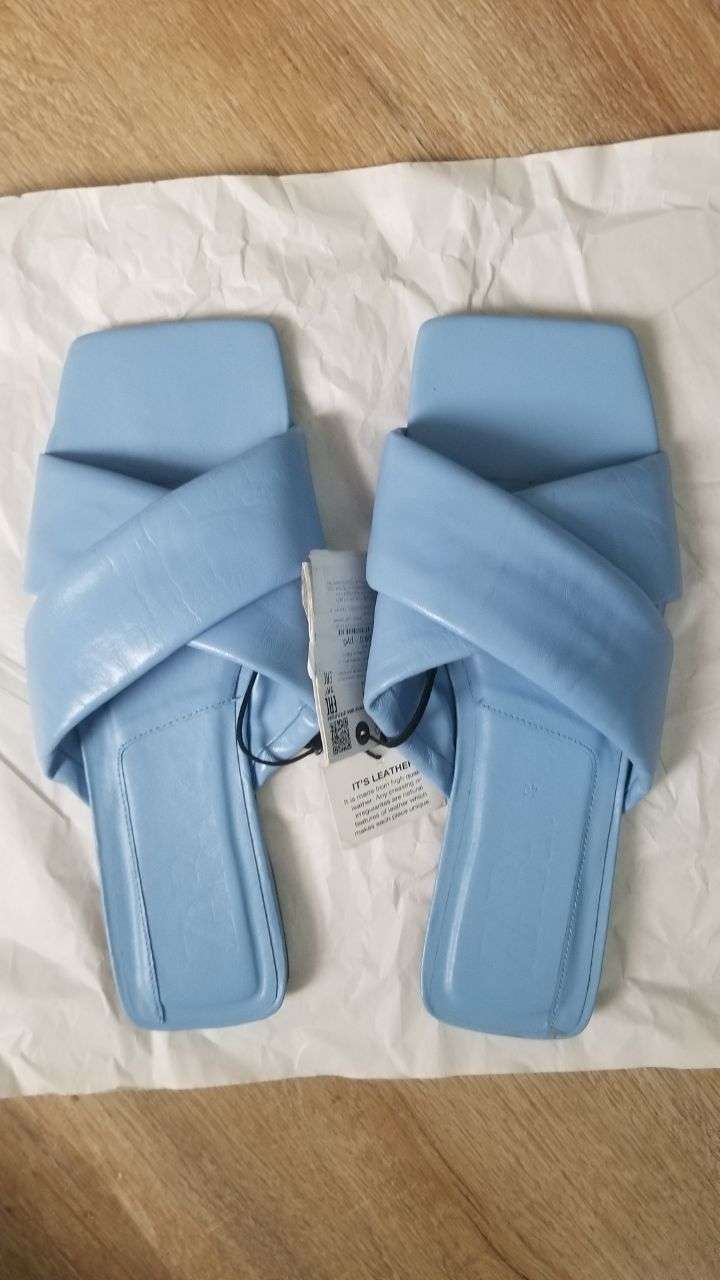 Продаю НОВЫЕ шлепанцы бренда ZARA, натуральная кожа, великолепный летний ярко-голубой цвет. Размер написан 40, подойдет и на 40,5. На узкую и средней ширины стопу. Куплены в официальном магазине до ухода бренда. Цена 2500 рублей.