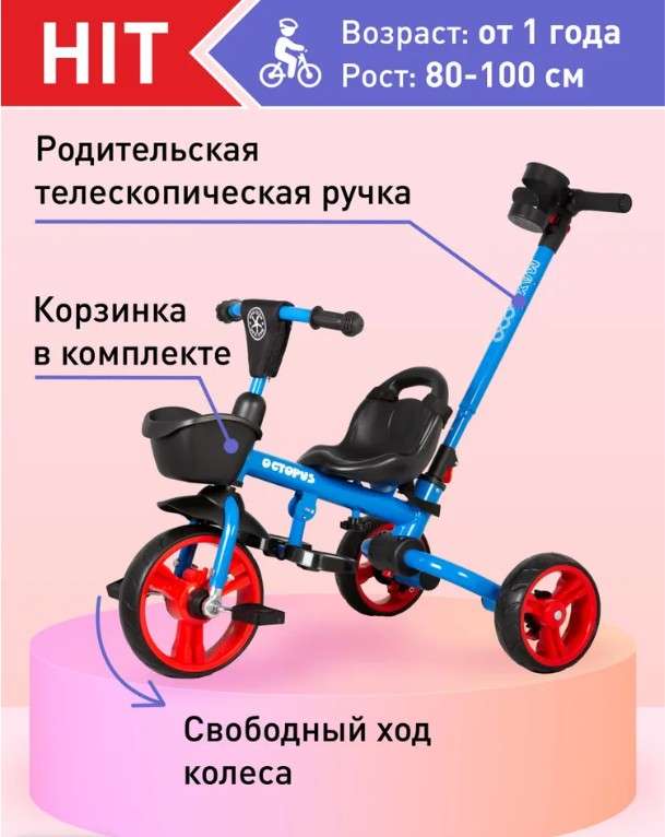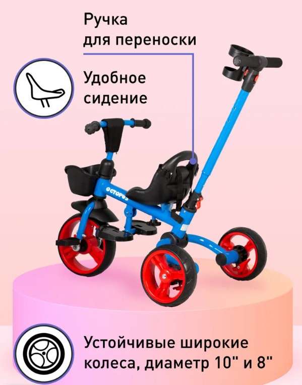 Складная конструкция. Родительская телескопическая ручка-толкатель с возможностью контроля направления движения. Колеса с функцией свободного хода переднего колеса. Удобное пластиковое сиденье с ремнем с ручкой для переноски. Корзинка на руле для перевозки мелочей. Прямой руль с мягкой накладкой с кармашком. Устойчивые широкие колеса (EVA). Переднее колесо – 10”. Задние колеса – 8”. Блокировка задних колес. Прочная рама. Вес велосипеда 6,4 кг. Максимальная нагрузка 35 кг. Возраст от 1 года.