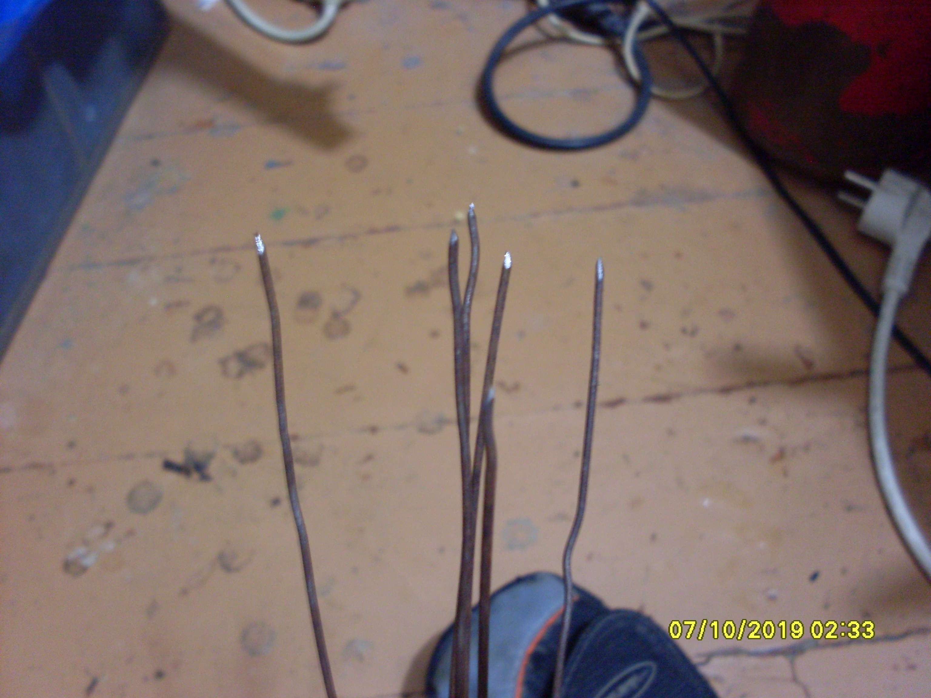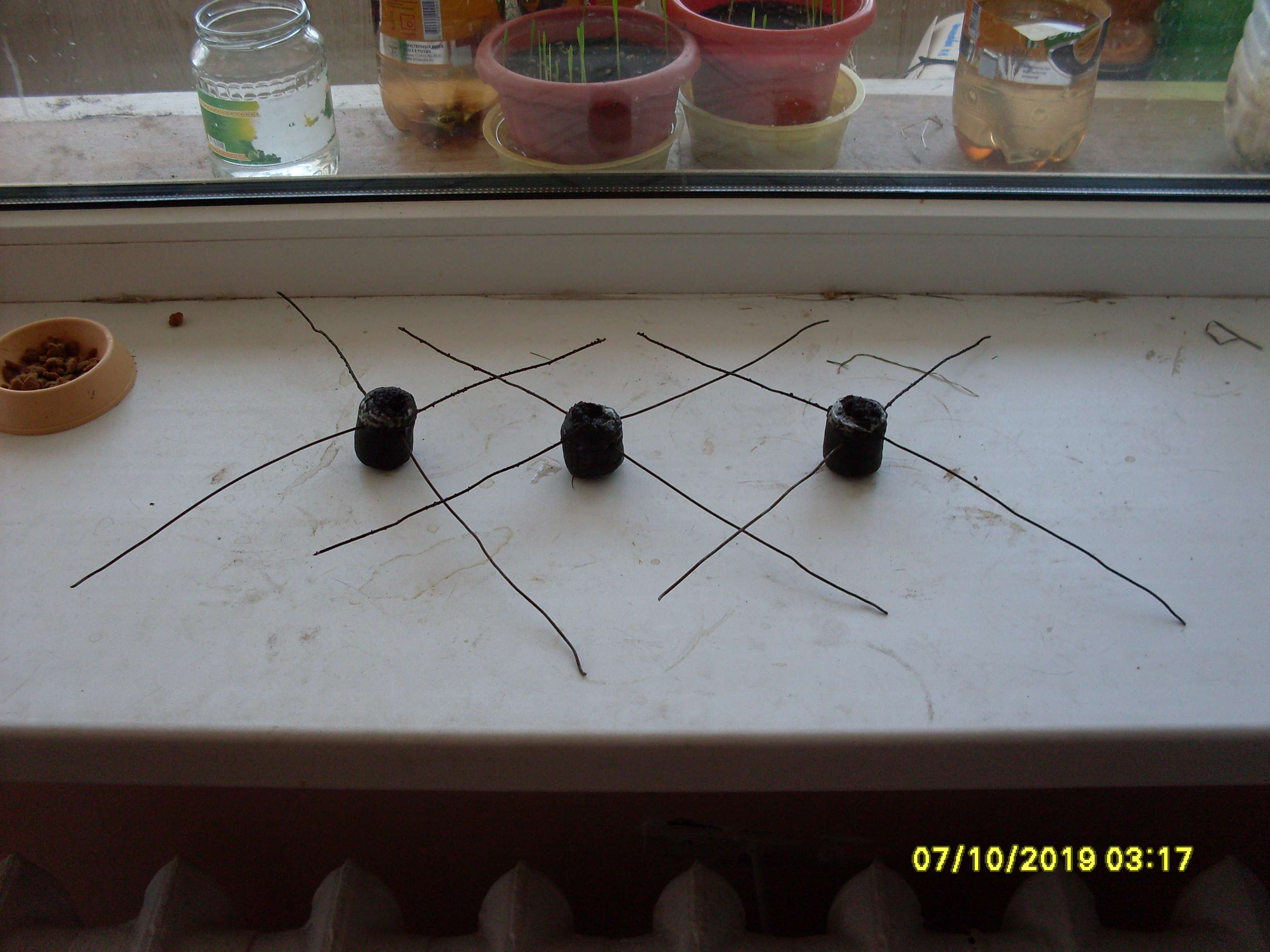По хорошему таблетки протыкаться проволокой не хотели - сминалась таблетка от проволоки а протыкаться никак. Пришлось затачивать (заострять) концы проволоки на наждаке и так нехотя, таблетки всё-таки проткнулись, получился такой своеобразный торфянометаллический паук!