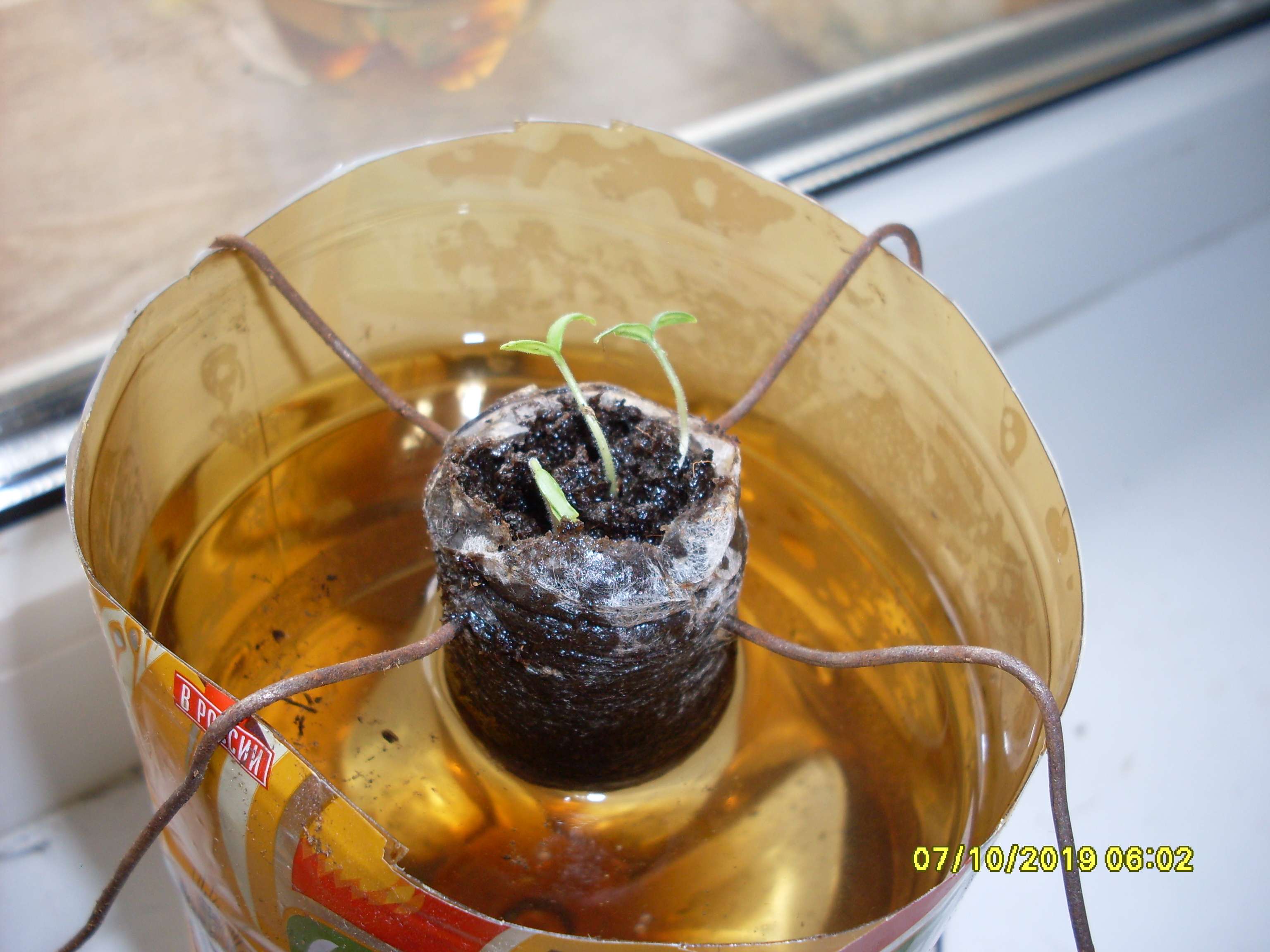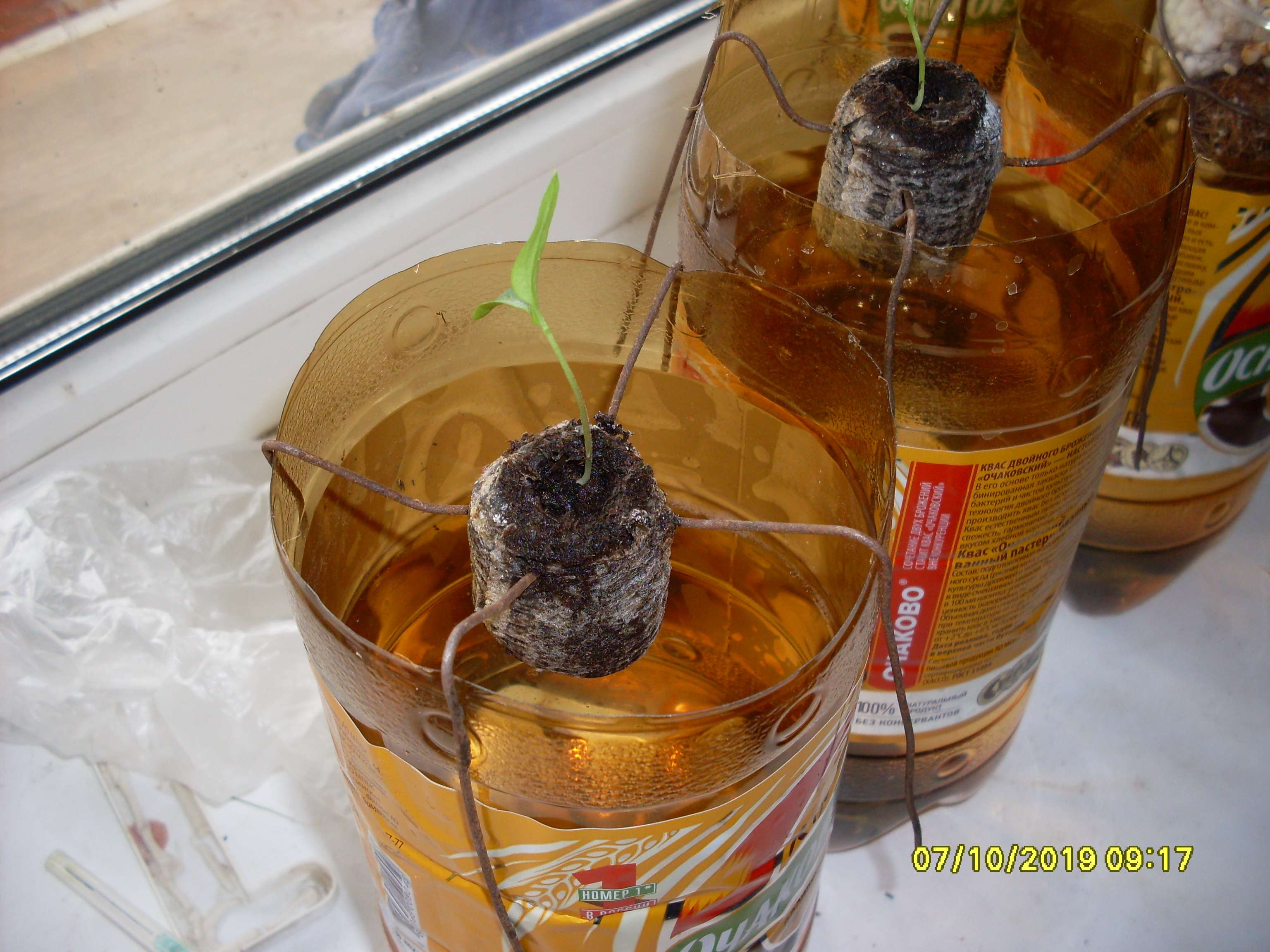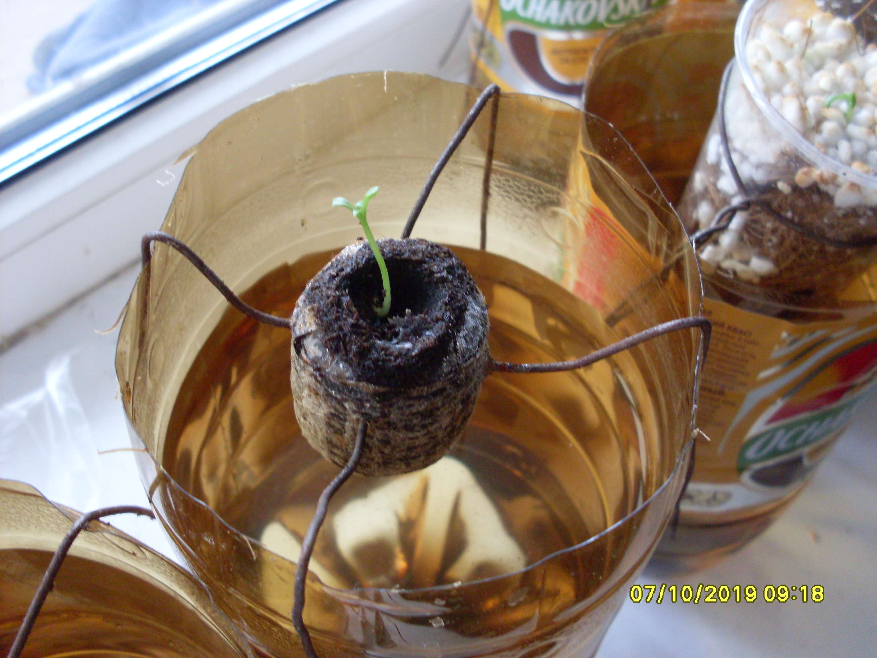 Теперь произведены следующие изменения. После прорастания в ватных дисках, растение, помещалось в торфяную таблетку. Торфяная таблетка протыкалась, в верхней части таблетки, проволокой стальной отожжённой, двумя стержнями поперёк таблетки (см. фото). И таблетка с проволокой помещалась в обрезок бутылки из под кваса, концы проволоки загибались и получалась таблетка висящая в воздухе, с проникшими в раствор корнями. Уровень воды (раствора) не достигал дна стаканчика где-то 2-5 см.
