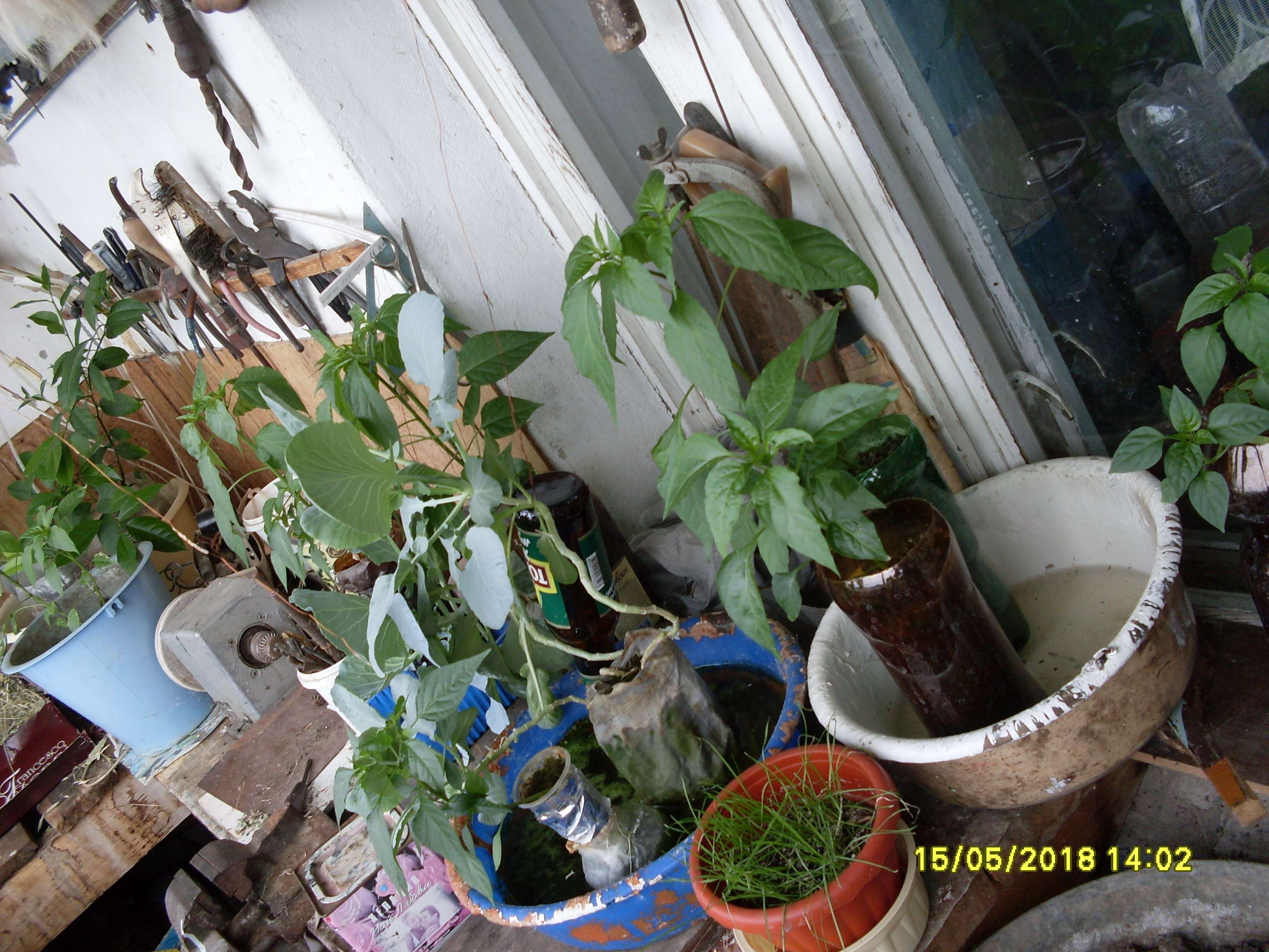 Ну у мене есть домик и на участке высокие грядки. В одной зелень, в другой 4 баклажана, 2 помидора черри, 2 сладких перца чисто на гриль. И 2 грядки под острые перцы. На трёх грядках капельный полив в напорной трубке. Зелень 4 форсунки под туман. Ну а перед грядками, как обычно рассада на окне.
