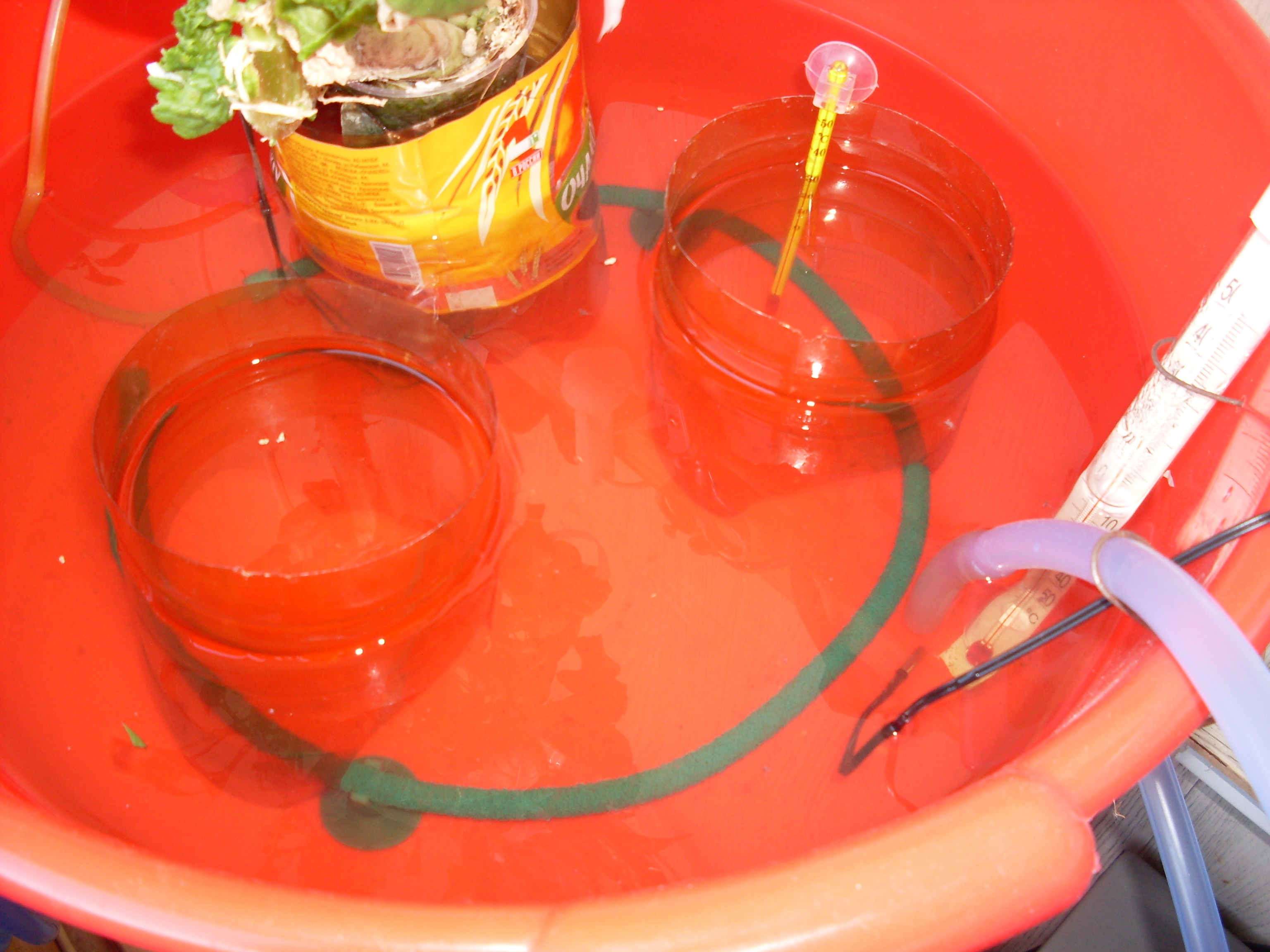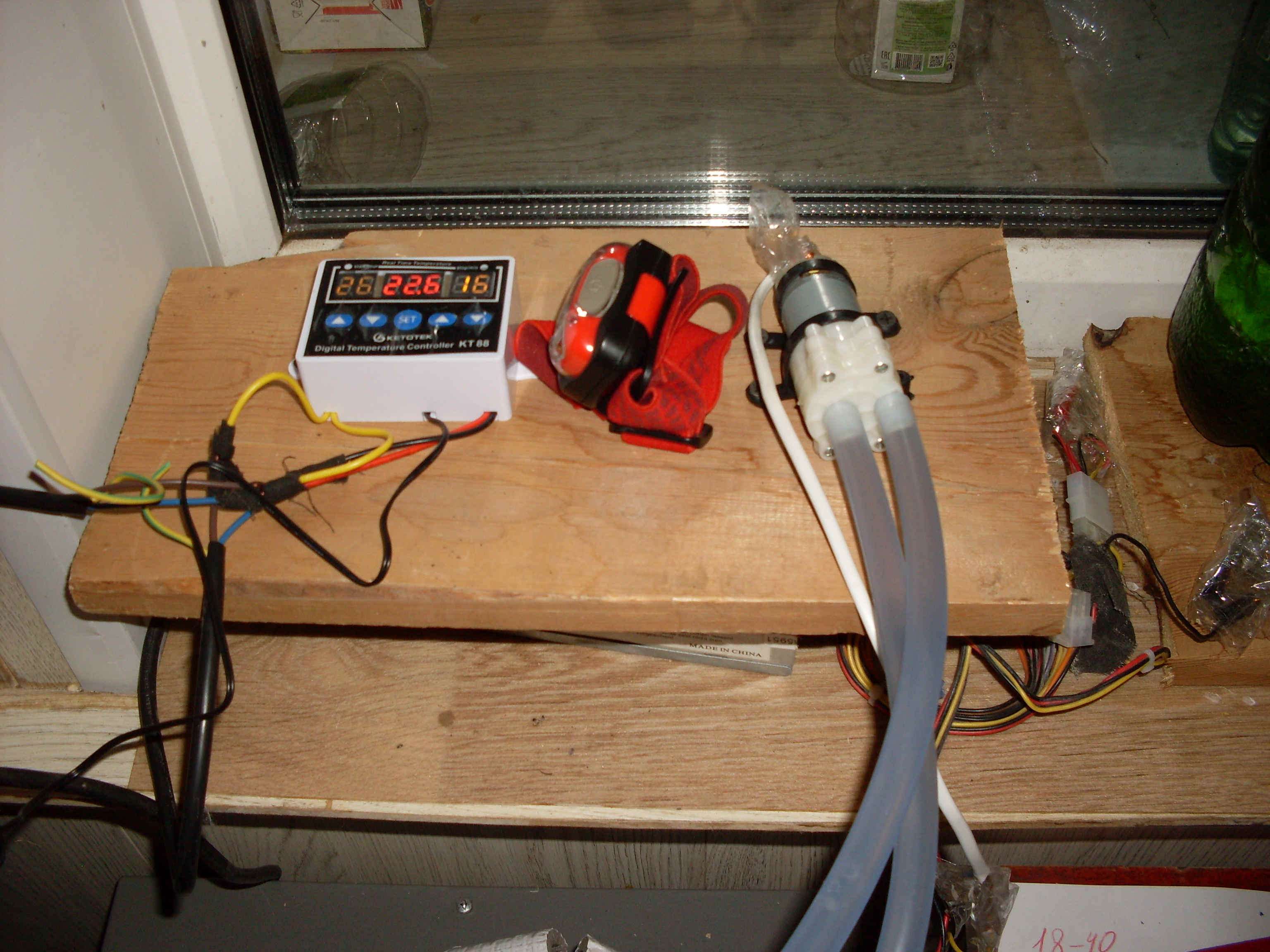 Постепенно настраиваю охлаждение. Нашёл в старых запасах мембранные помпы, но попробовав решил что хватит одной (у меня их две) напор нормальный. На фотках показываю змеевик, в охладителе. И многомученический хрен "дайкон". Хрен обильно отцвёл и теперь скидывает листья. Цветы я ему благополучно отрезал.