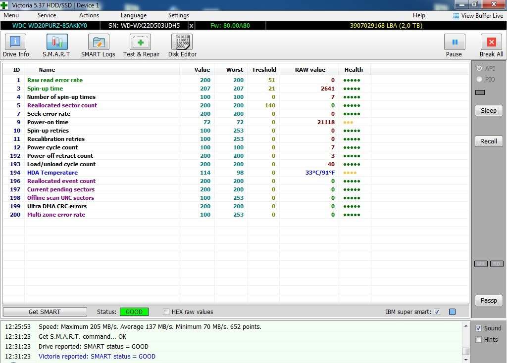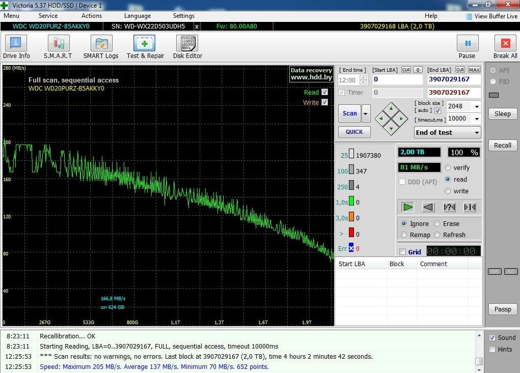 Продам жесткий диск 3.5" 2Tb WD Purple WD20PURZ-85AKKY0 Состояние на скринах. 2300 рублей.