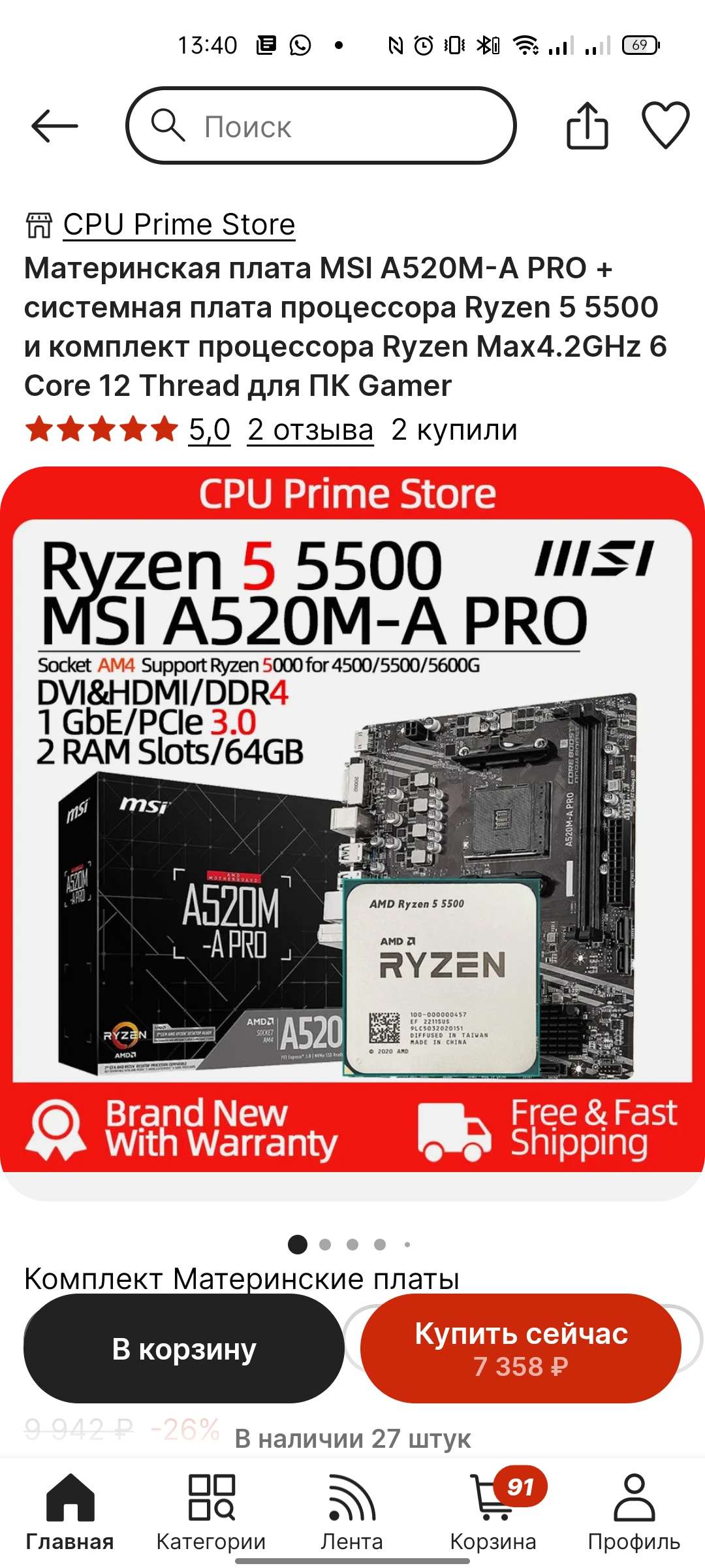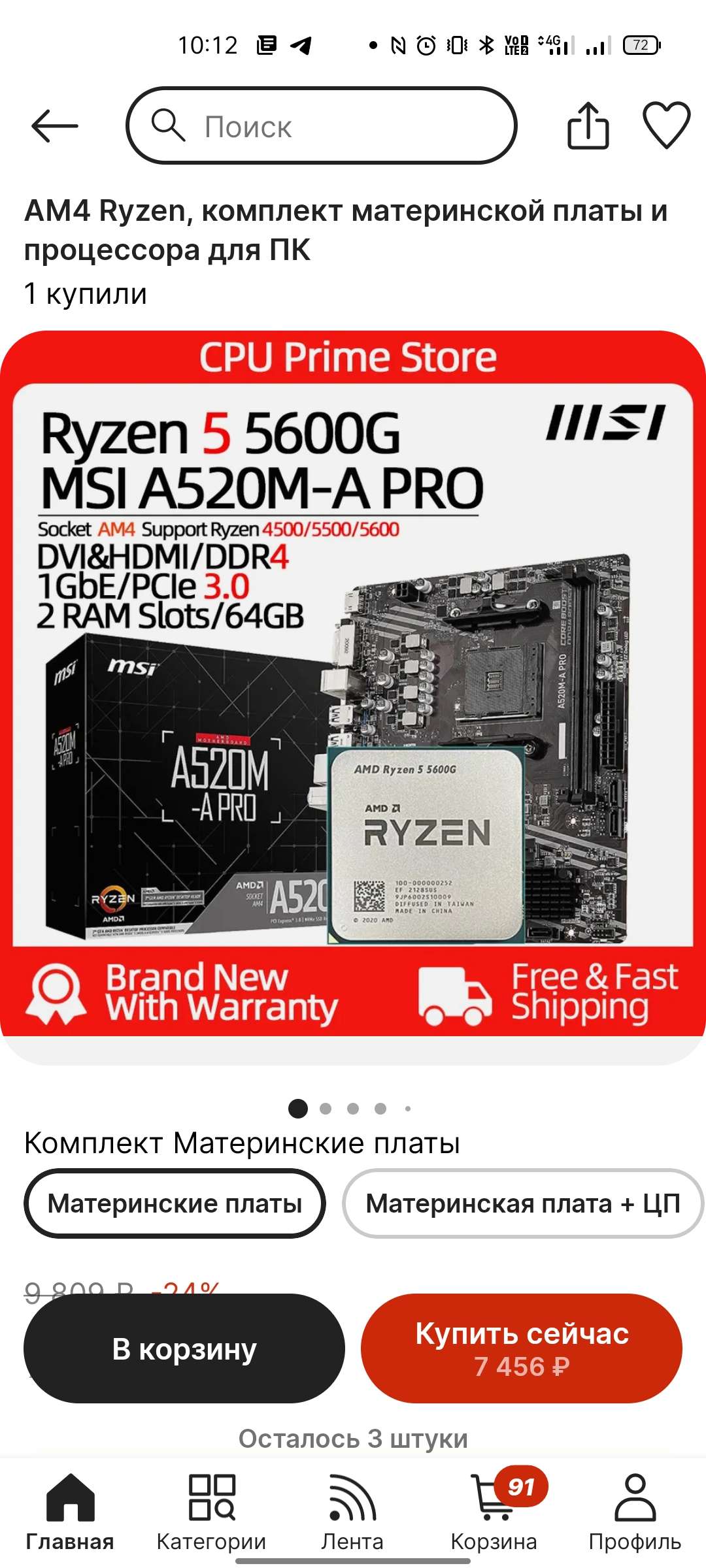 Если открывать в приложении, то там ценник 7200 за плату и процессор! Все оформляется.