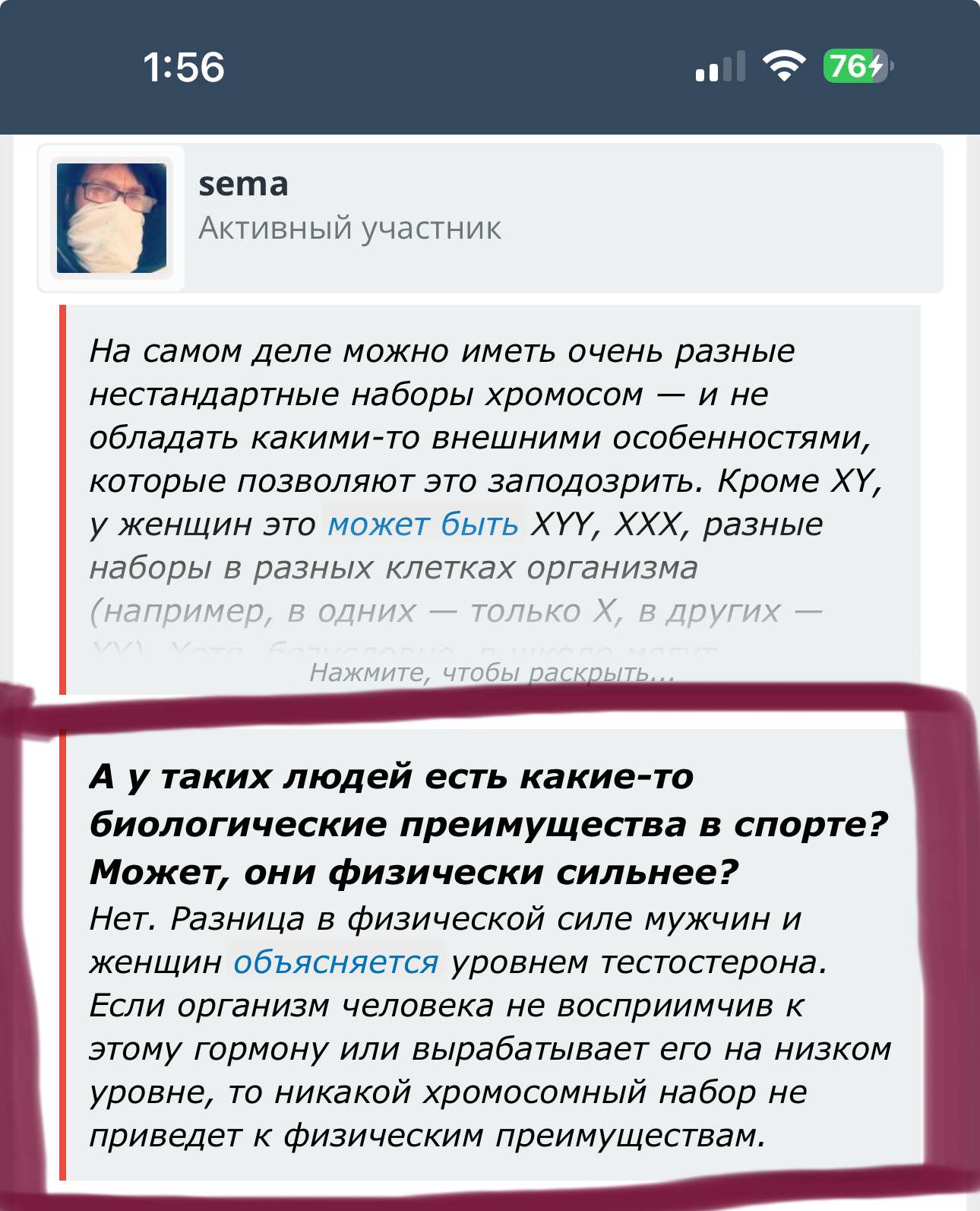 Зачем мне биология, тут без наук всё понятно. Природа дала тебе писюн, носи его с честью. Это обыкновенное дырявое угрёбище, которое все детство подвергалось унижениям со стороны пацанов, резко решила, что оно теперь телка и пошла метелить нормальных тёток. Всё. Остальная галиматья про интерсекс и хромосомы в пользу таких же ущербных и обиженных личностей.