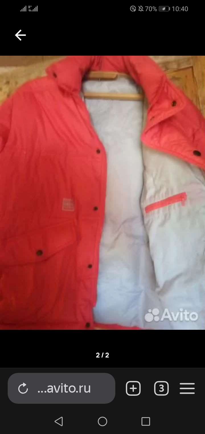 Здравствуйте. Коричневого цвета куртка одевалась 1 или 2 раза. Шуршащий материал, очень лёгкая. Красная куртка б/у. Более тёплая.