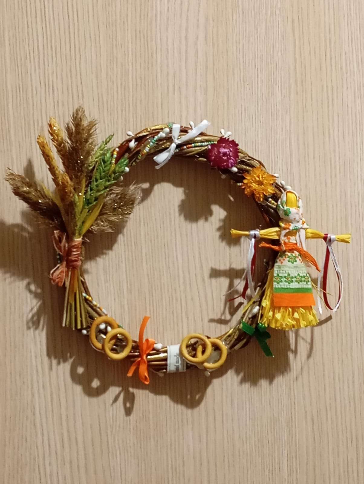 Материалы: ивовая лоза, мочальное лыко, сухоцветы, бисер, атласные ленты, сладкие колечки.