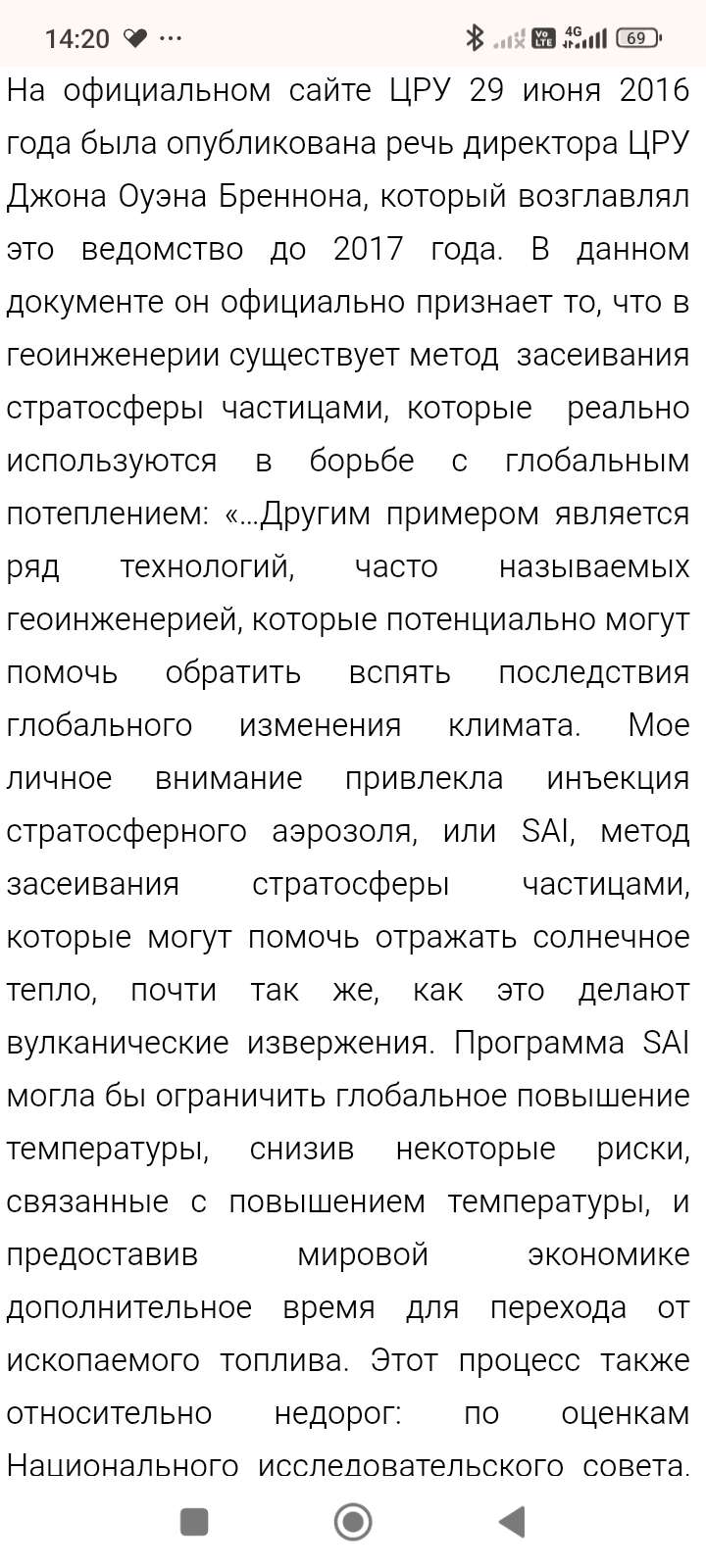 Сёма, никаких теорий заговора не существует. Уразумей. Это социальная инженерия. Мало ли кто во что верит, в чем пытается кого-то убедить? Не надо слепо доверять. Ты доверяешь, что с самолётов не распылить алюминий. Но тебе чёрным по белому написано о цели геоинженерия для охлаждения Земли выбрасывать тонны алюминия в аэрозоля в год. От ведущего геоинженера. Ты в состоянии принять этот факт? Тебе приведены свидетельства людей, которые делали лабораторные анализы, нашли превышение, причем многократное. Тебе приведены речи в ООН. Акт Конгресса, где химтрейлы причислены к экзотическим вооружениям. Ты продолжаешь верить, что алюминий и пр. не распыляют. Верь на здоровье. Создай свою премию "Алюминиевая дуля" и вручи мне. А Вам к нему надо было ещё вчера. Накануне 11 сентября Счетная палата уличила Пентагон в сокрытии десятков триллионов долларов. Ты, наверное, веришь, что они все пошли на шлюх, а я вот сомневаюсь. Overclockers.ru: Шестой год подряд Пентагон проваливает аудит Я вот вполне допускаю, что изменением климата занимается глубинное государство. Причем уже не первый век эта тема стоит на повестке у глобалистов. Они могут менять погоду на Земле своей геоинженерией. Чтобы под песню о глобальном потеплении лишить человечество прав. Как в ковид. Сейчас поищи отчеты и официальные исследования о ковид, их нет и не будет, и о вакцинах нет и не будет. А неофициальные ты мне видишь в упор потому что "конспирология". Почему внезапно нет ПДК на алюминий в окружающей среде? Это просто так произошло? Это практика заговора, не?