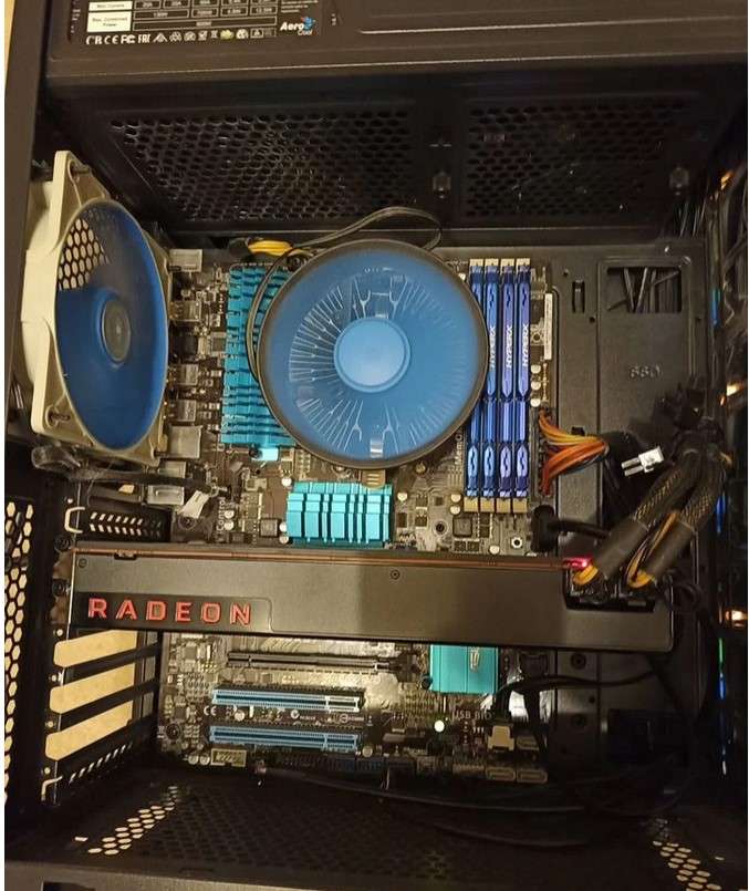Тащит не сильно требовательные игры, CS2 на средних в 1080p 60-100FPS выдает. Хороший и не старый блок питания. Win10 Home активированная. Видео Radeon RX Vega 64 8Гб, от нее есть коробка, но не работает внешняя подсветка, оборвал провод при разборке, когда резинки менял, можно починить, но лень и на работу не влияет. SSD не так давно ставил, есть коробка, HDD 1Tb для игрушек. Корпус с подсветкой неуправляемой, т.е. всегда светит. 4 корпусных кулера 120мм. Мать ASUS M5A97 R2.0, с доп.радиаторами на дросселях. Память 4 планки Kingston, работает на частоте 1866 в двухканальном режиме.