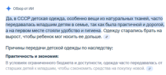 зы. вот тебе на майлру ветка про практичность. Плюс нужно учитывать советский меналитет, к примеру хлеб было выкинуть западло и т.п. Видимо пришло ещё с послевоенных времен, когда действительно ничего не было и полстраны в руинах, imho кстати почему то мне ии про низкое качество ни разу не написал, несколько раз пробовал, тексты разные, но вот такого не встречал. У тя там случаем не айфон? И расскажи мне каким образом одежду низкого качества сможео было годами носить передавая из поколения в поколение? Китайские то трусы вон по большей части одноразовые