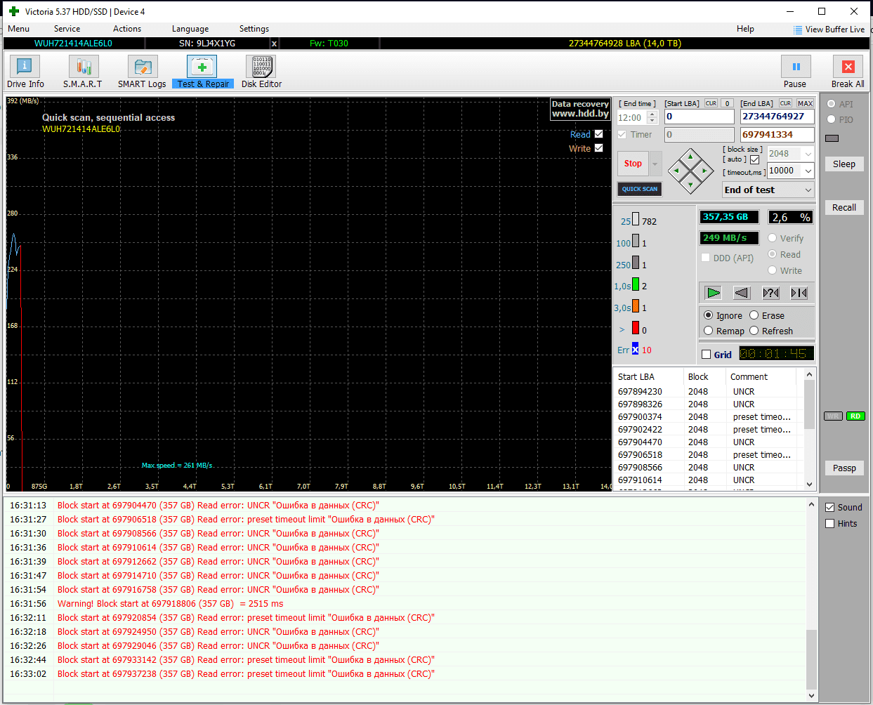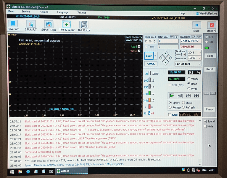 короче диск сдох вообще окончательно. При каждом запуске ему становилось всё хужее и хужее ... Теперь даже Виктория не видит его поверхность... Направил претензию, отфутболили сразу. Типа только через экспертизу за Ваш счёт. Направил вторую самому OZON как соответчику, по новому закону сейчас так можно. Эти ответили что мой БП не может работать с таким диском (!?) Короче начинается футбол в одни ворота ...