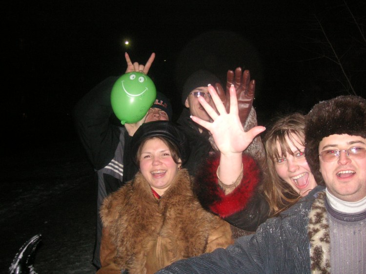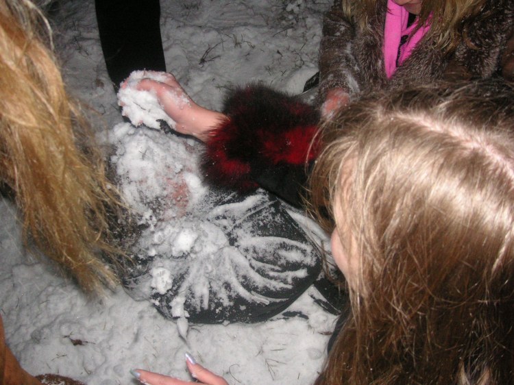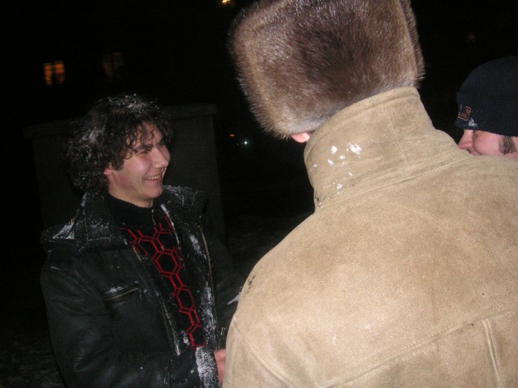 Все очень ждали именниника. И как только он появился, то сразу же закидали его свежениким снежком. Бедняга был очень обескуражен.