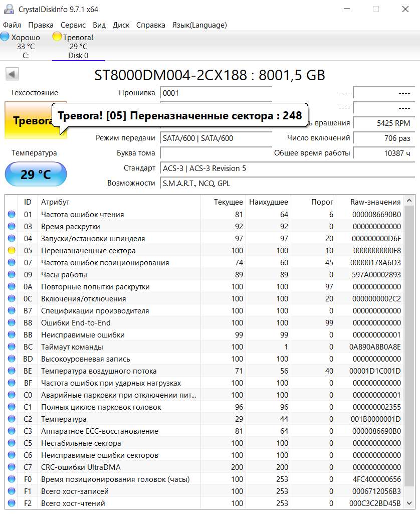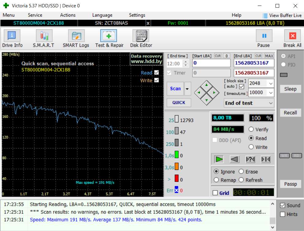 Продам HDD Seagate Barracuda 8 Тб ST8000DM0004. Технология записи SMR, 5400 оборотов. Диск с бэдами. Наработка всего 10000 часов с постоянным охлаждением. Использовался для хранения фильмов. Последние 3 года стоял вообще выключенный. При включении показал бэды. Не ронялся, не стукался. Данные все считались. Прогнал викторией с целью заремапить, она ничего не нашла. Видимо, сам диск уже заремапил. Ради эксперимента залил с нуля фильмов на фулл объём. Всё записалось, бэдов не прибавилось. Фото живые. Цену предлагайте. 8-905-399-53-52 Антон