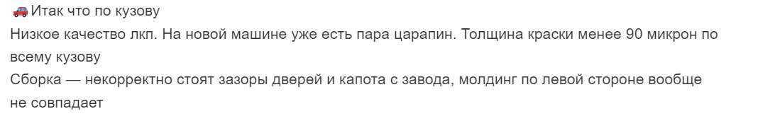Я вот воспользовался гуглом про премиальные китайские авто, начал задавать вопросы - а ты от них ушел. У меня старенькая джетта, с момента покупки в 2019 году - на пороге скол, больно большой - кирпич попал, так вот - там до сих пор за 5 лет не появилось ржавчины, потому что автомобиль с гальванической оценковкой. А премиальные грейт волы - покрываются порошком, т.е. на 2 ступени обработка кузова ниже. Пинки коробки, зазоры на премиум китайце (снова вынужден повторяться), нет истории по движку - а проедет ли он 100 ткм вообще - но я понимаю, выбора нет - купил китайский авто - надо идти до конца. Кстати, я еще воспользовался гуглом - про отзывы о ЛКП премиум китайцев (конкретно об GW), от владельца, он ниже И вот, еще загуглил про качество сборки премиум китайцев - ну вот на конкретно одной модели - на всех машинах вот такие кривые зазоры - с завода. Наверное, это норма для Китайского премиума. У меня на поло, джетте, элантре (новых авто) - такого с завода не было, ну оно и понятно - куда этим маркам то до премиум китайца ))))) +
