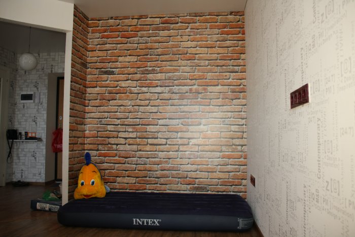 В ОБИ есть гипсовый "клинкер", крепится на жидкие гвозди\кафельный клей. Режется ножом канцелярским, очень удобно. 3 ящика (3м2) 1800 рублей выходит. Очень красиво. Обои - ацтой, не выразительно, а толстые обои будут дороже "клинкера". Клинкер, металлическая канальная вентиляция, потолок балковый, свет без плафонов...аля "гараж-стаил"...очень прикольно будет, запчасти от моцика декоративные на стенку...эх, почему мое детство прошло в казармах с синей краской ...