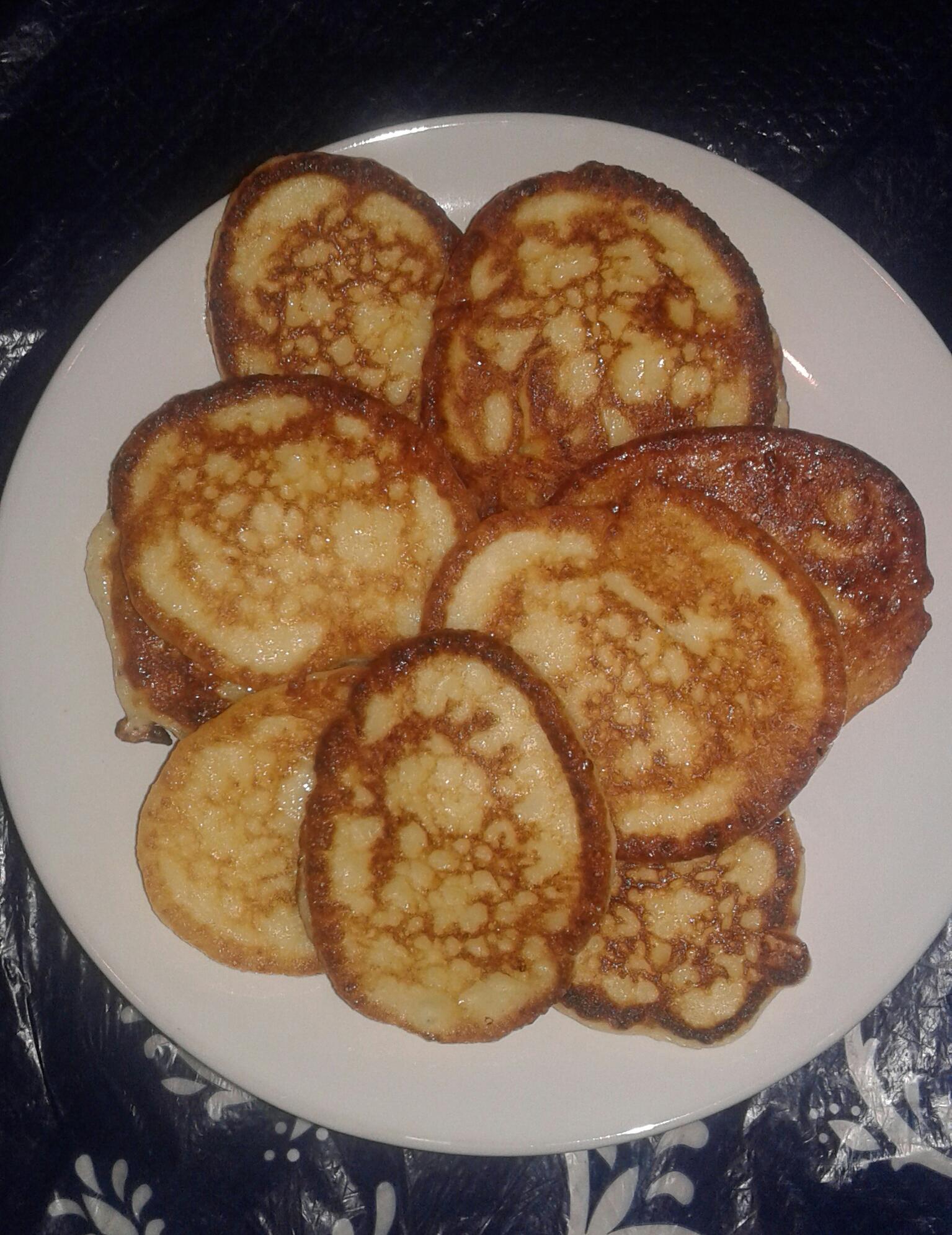 @ToXa, всё девять ешь утром) Блины на кефире без яиц Кефир 250мл Разрыхлитель/сода Соль щепотка Сахар 1ст л Мука 130гр Масло растительное 2ст л Вода кипяток 100мл Смешиваем кефир, муку, разрыхлитель, соль, сахар до однородной консистенции. Вливаем кипяток, замешиваем. Добавляем растительное масло, перемешиваем и оставляем тесто минут на 15. Выпекаем. Смазала сливочным маслом и посыпала сахаром.