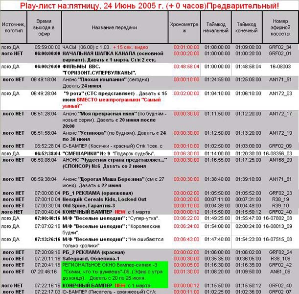 Pif Рекламные ролики перешли в собственность канала ОРТ? FIRS Кроме ShowView в неактивной части кадра размещаются и телетекст и измерительные строки. Это к слову... Между тем большинство центральных телеканалов, для ретрансляции в регионах, передают сигнал по цифровым каналам спутниковой связи, где в целях экономии трафика неактивная часть кадра (кадровые гасящие импульсы) не передаётся. По этому канал с реально работающей системой ShowView в Волгограде найти сложно .